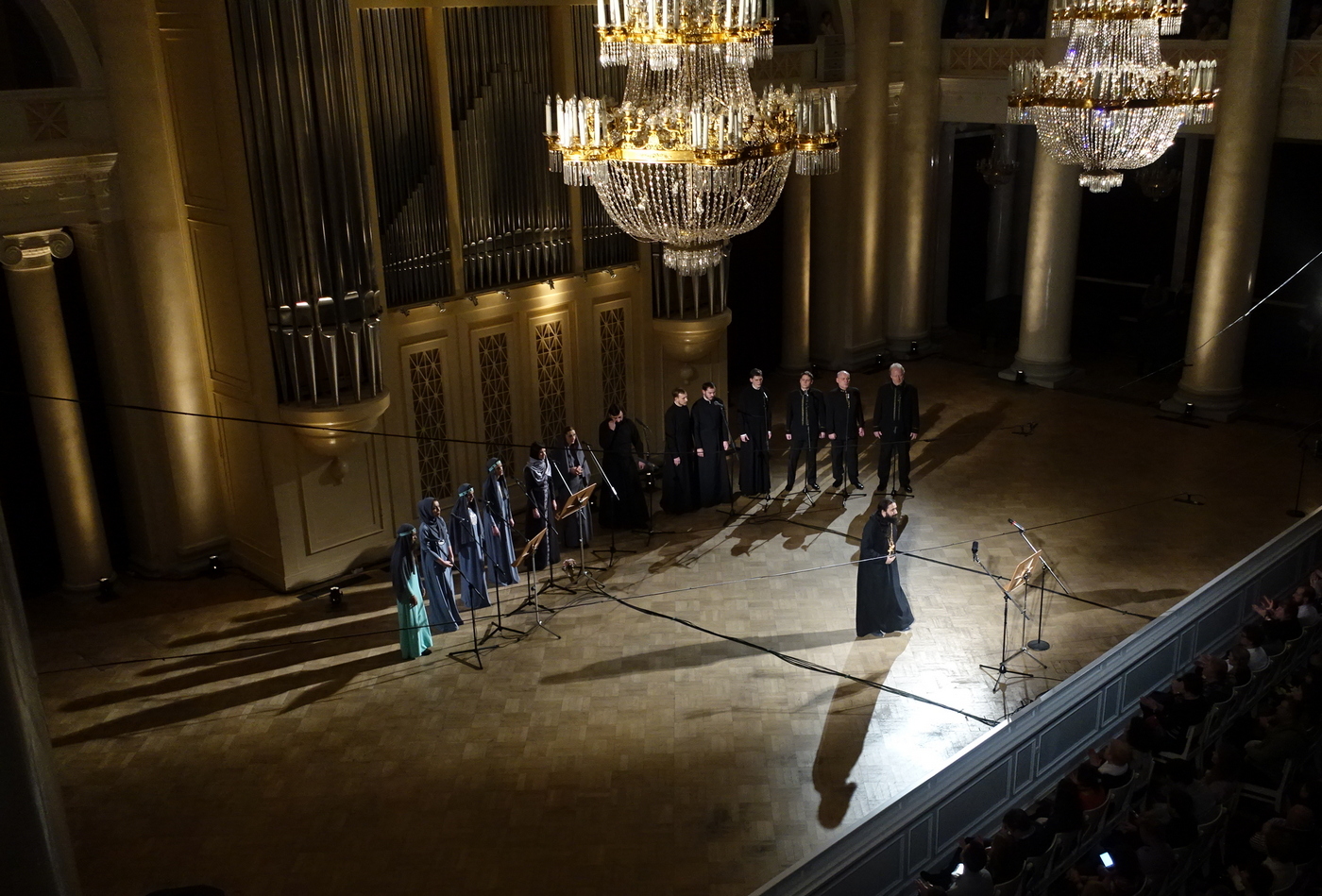 Прозвучавшие священные гимны в основном уже были известны слушателям. Серафим Бит-Хариби спел на арамейском языке и сымпровизированную им во время поездки на Валаам «Молитву в Гефсиманском саду», и «Отче наш» (сделав перед пением комментарий относительно тонкостей произнесения на арамейском), и собравший в интернете многотысячные просмотры покаянный Пятидесятый псалом. Знаменитое рождественское песнопение «Алило» на грузинском языке было исполнено даже дважды. После просьбы из зала спеть без микрофонного усиления музыканты демонстративно встали на авансцену и достаточно легко озвучили пространство Большого филармонического зала. После еще одной просьбы представить что-нибудь на русском языке отец Серафим попросил хор поддержать его длинным выдержанным тоном в гимне «Богородице, Дево радуйся».