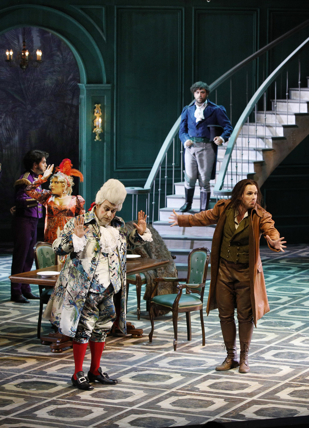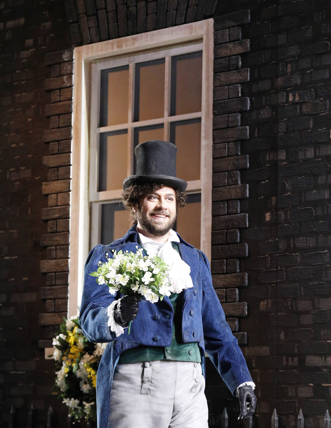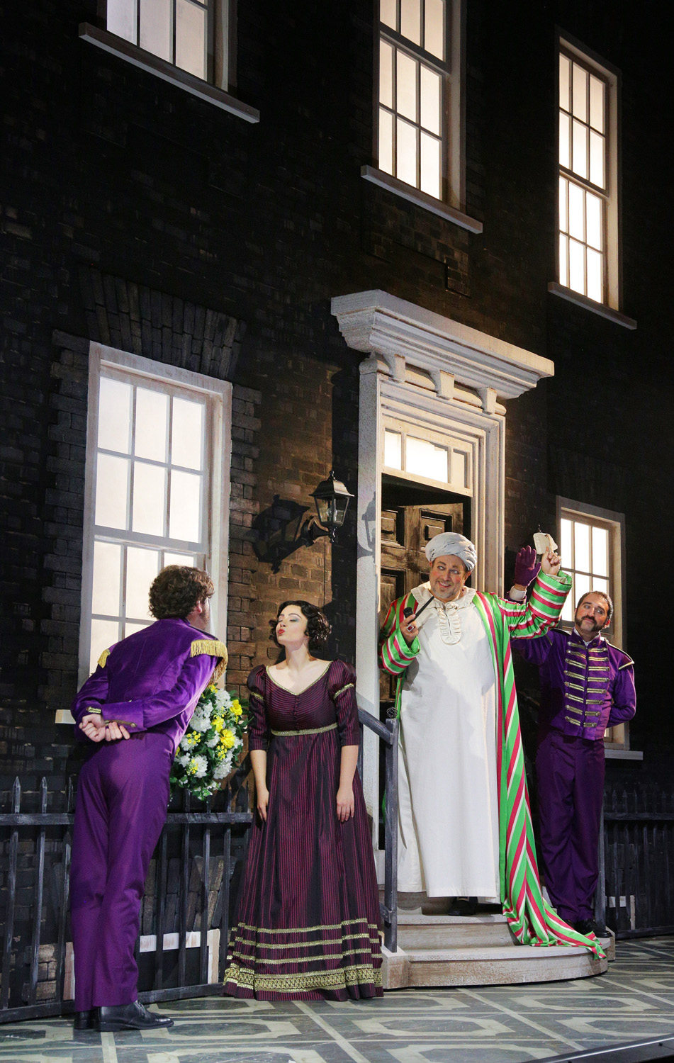 Как многие европейские фестивали, Россиниевский оперный в своих постановках пробует разную стилистику. Однако на этот раз публику решили порадовать добротным традиционализмом. На сцене рубеж XVIII – XIX веков: солидный дом георгианской эпохи и соответствующие костюмы. Пытающийся выглядеть солидно Тоби обряжается в пудреный парик (дань веку уходящему), молодое поколение уже одето по моде наполеоновских времен (сценография и костюмы Гэри Мак-Кенна). Все изящно и радует глаз, не противореча музыке и сюжету.