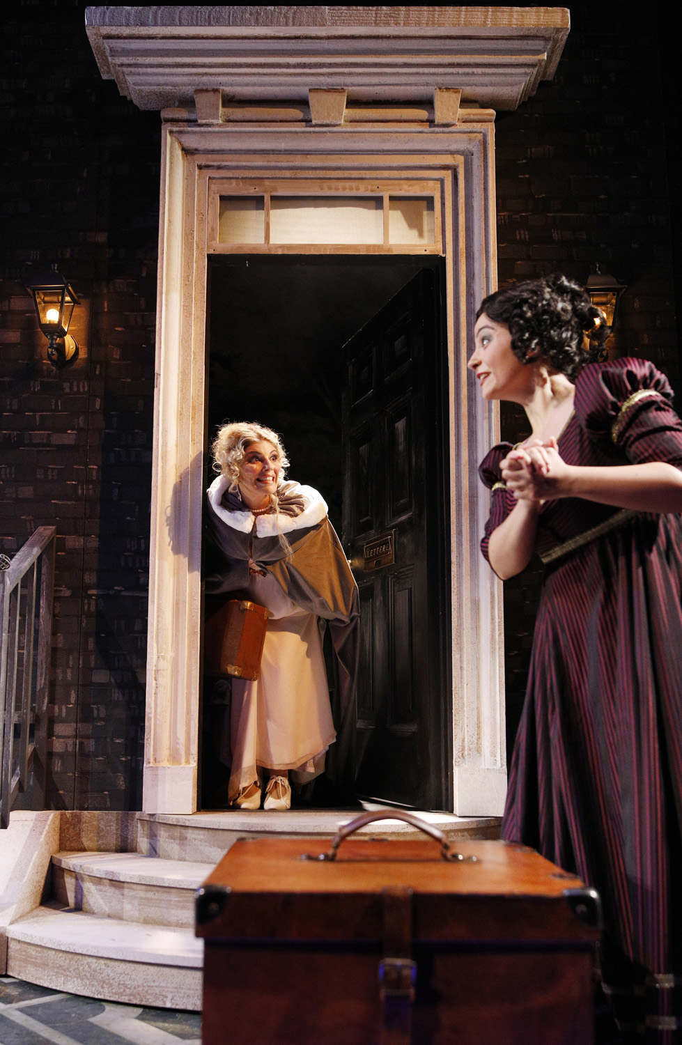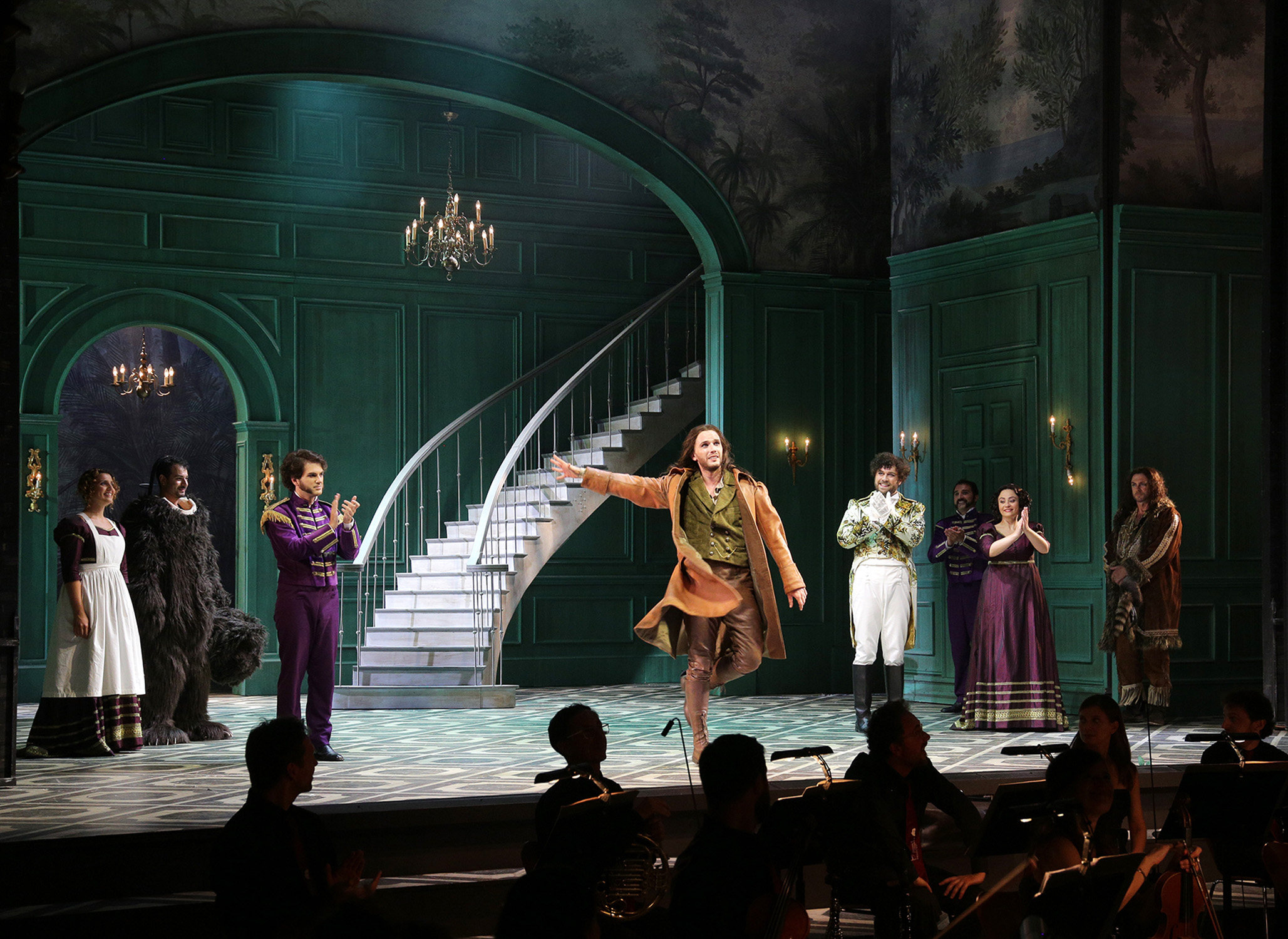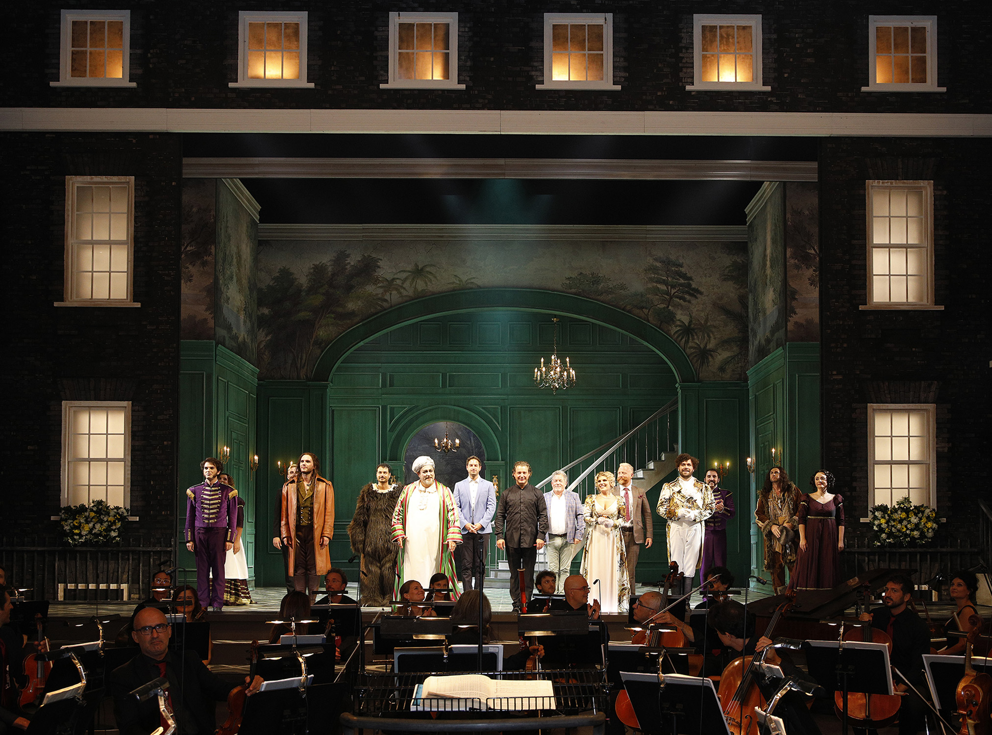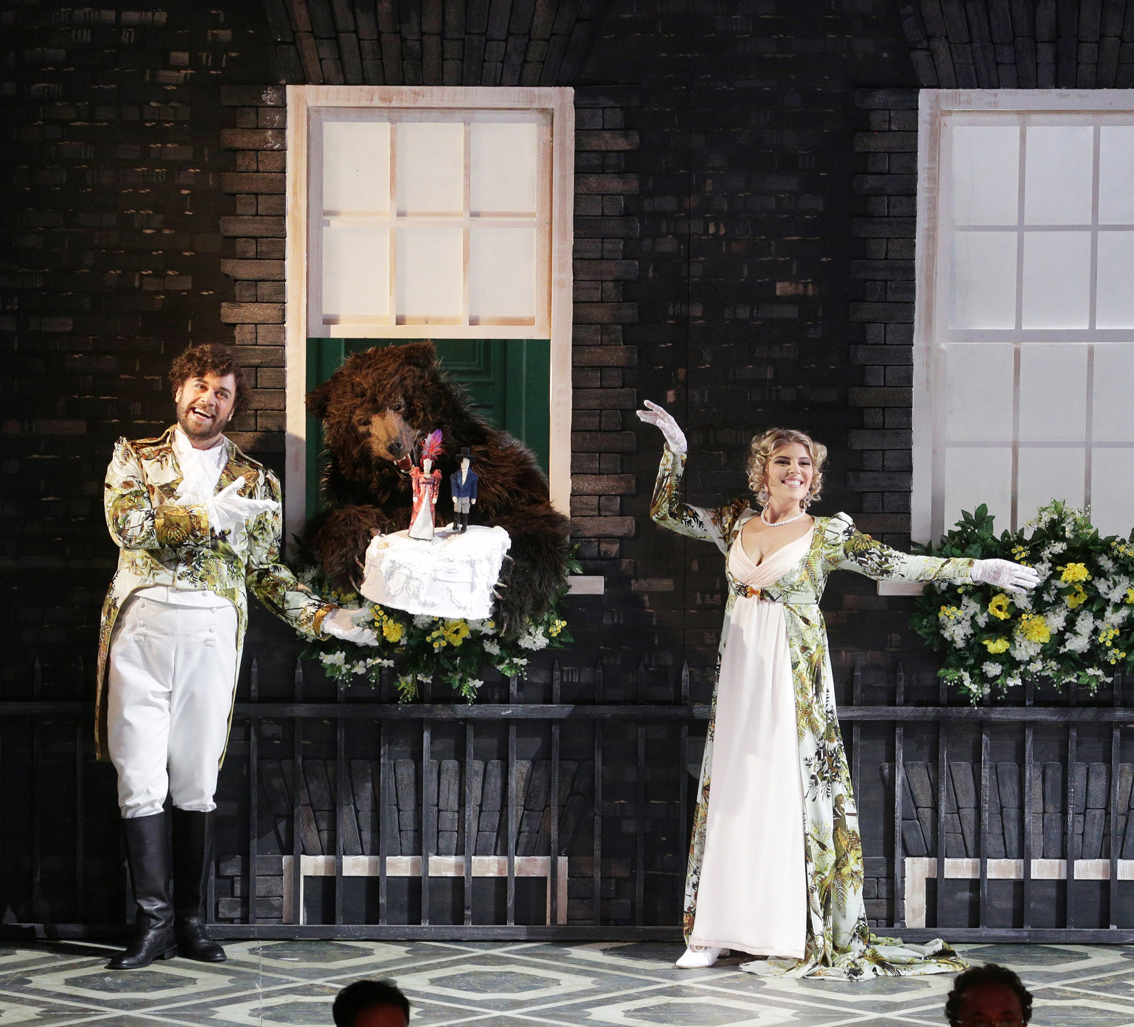 Как многие европейские фестивали, Россиниевский оперный в своих постановках пробует разную стилистику. Однако на этот раз публику решили порадовать добротным традиционализмом. На сцене рубеж XVIII – XIX веков: солидный дом георгианской эпохи и соответствующие костюмы. Пытающийся выглядеть солидно Тоби обряжается в пудреный парик (дань веку уходящему), молодое поколение уже одето по моде наполеоновских времен (сценография и костюмы Гэри Мак-Кенна). Все изящно и радует глаз, не противореча музыке и сюжету.
