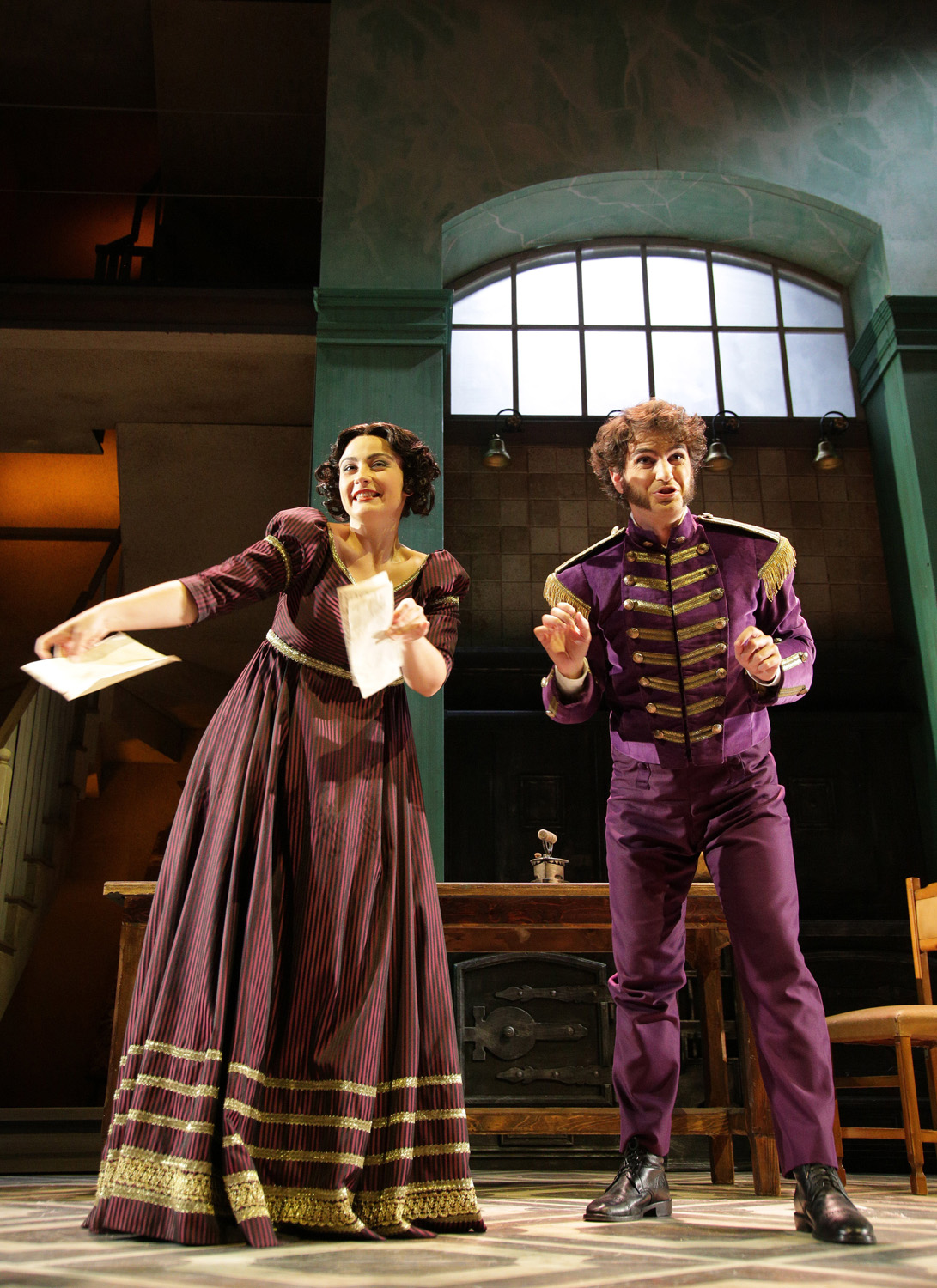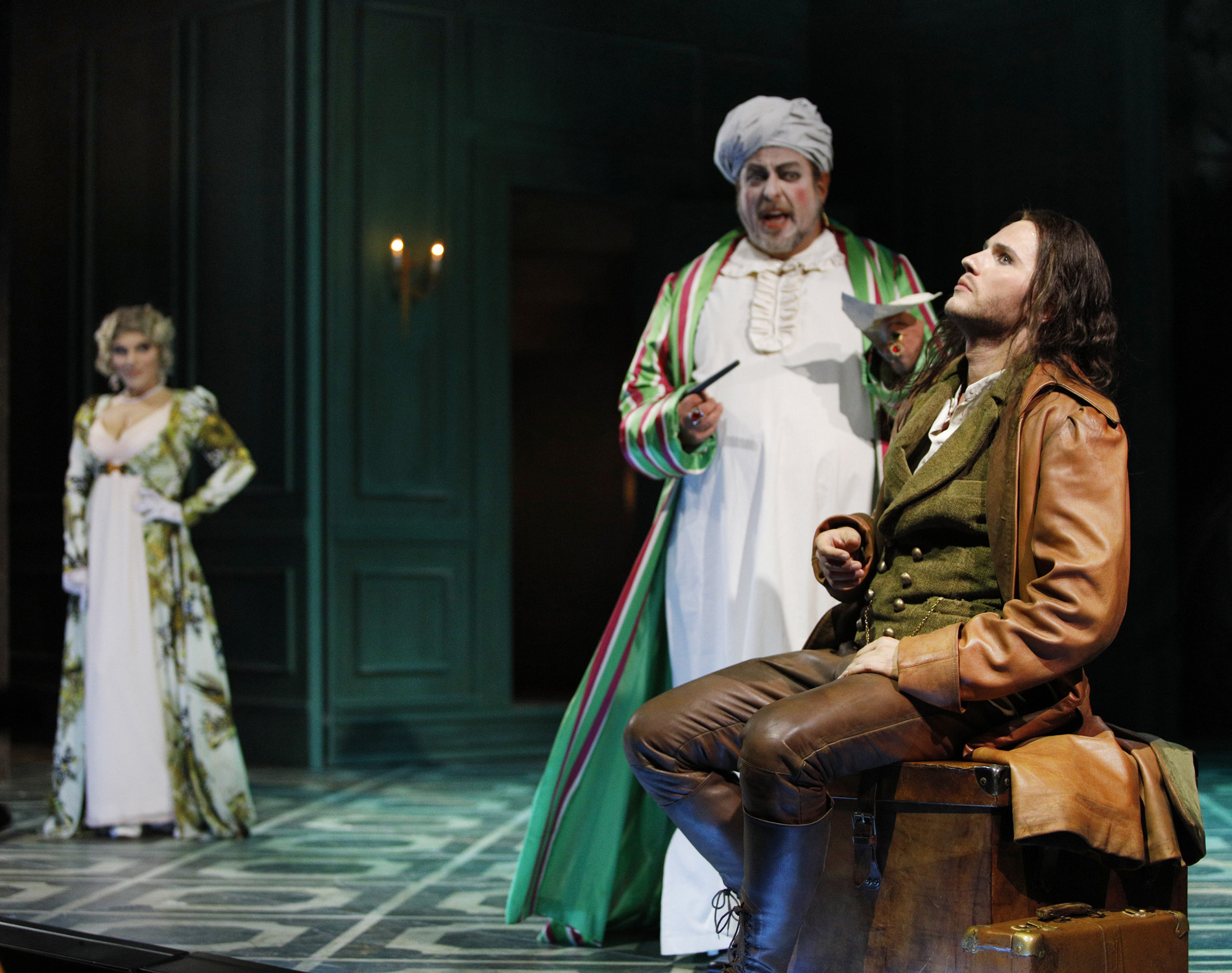Видимо, поэтому один из центральных персонажей оперы – меркантильный папаша Тоби Милл, мечтающий выгодно выдать замуж свою дочь Фанни, – почти весь спектакль обряжен в полосатую чалму и такой же полосатый восточный халат. Сразу вспомнились россиниевские оперы с ориентальным колоритом (типа «Итальянки в Алжире» или «Турка в Италии»), однако действие «Брачного векселя» разворачивается отнюдь не на Востоке. По сюжету в Англию прибывает богатый компаньон Тоби Милла – негоциант Слук из Северной Америки, который как раз и представляется ушлому Миллу выгодной партией для его Фанни. Однако красавец канадец, одетый по ковбойской моде, оказывается еще и гораздо благороднее своего британского компаньона. Восхищенный красотой Фанни, он, узнав, что ее сердце принадлежит другому, не только ее не неволит, но и способствует ее браку с возлюбленным, простив папаше долг и тем самым сделав возможным для Фанни получение достойного приданного.