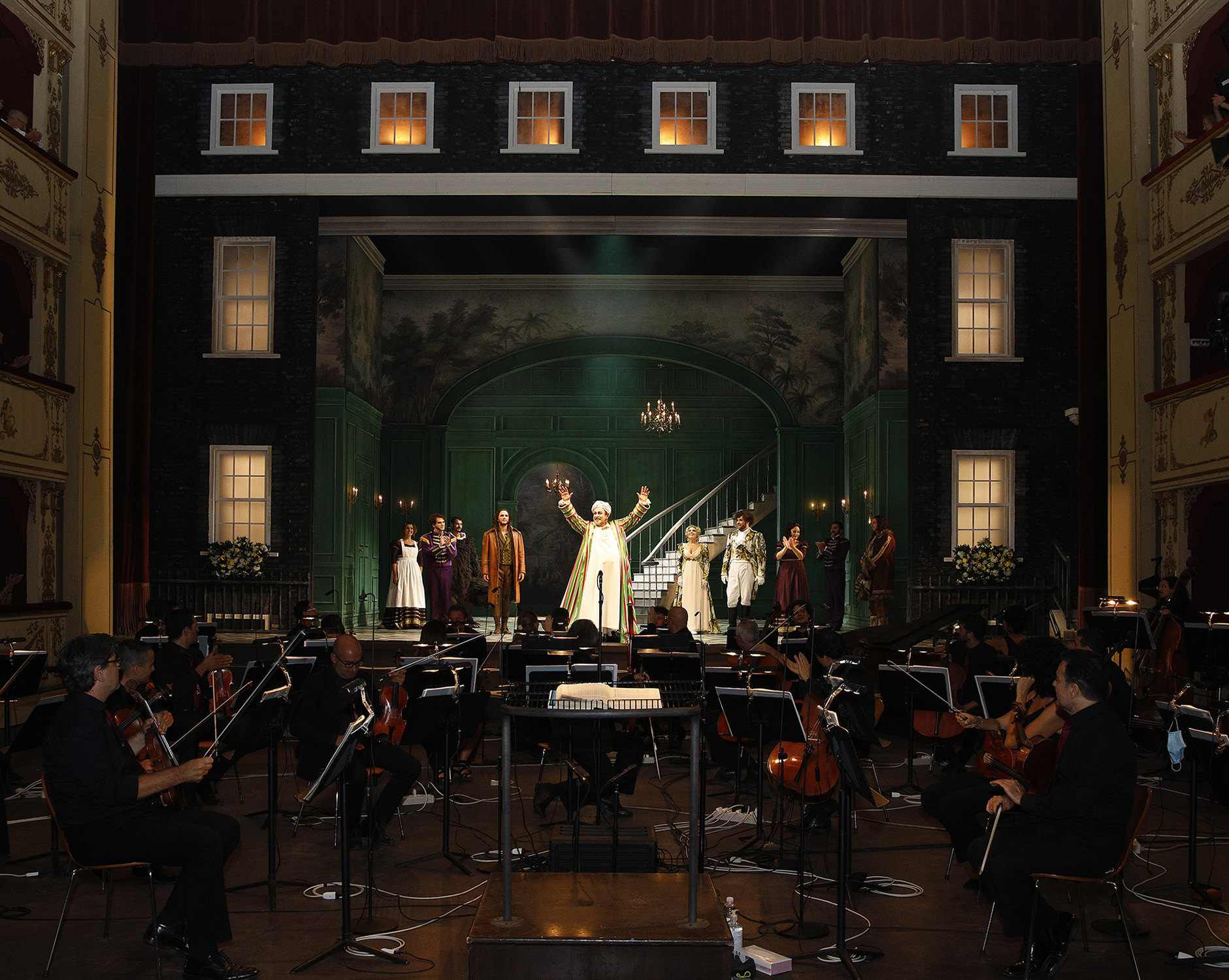 Одноактная комедия продолжительностью чуть больше часа как нельзя лучше подошла к санитарно-эпидемиологическим требованиям: коротка, не имеет хора и не требует антракта. Ее предварили исполнением кантаты «Жанна д’Арк», увеличившей продолжительность вечера на двадцать минут. Зал Театра Россини зиял оголенным партером – зрительских мест там не оказалось, в образовавшемся пространстве разместился Симфонический оркестр им. Дж. Россини (резидент фестиваля) в соответствии с новоявленными нормами социального дистанцирования. Публика расположилась в ложах на пяти ярусах.
