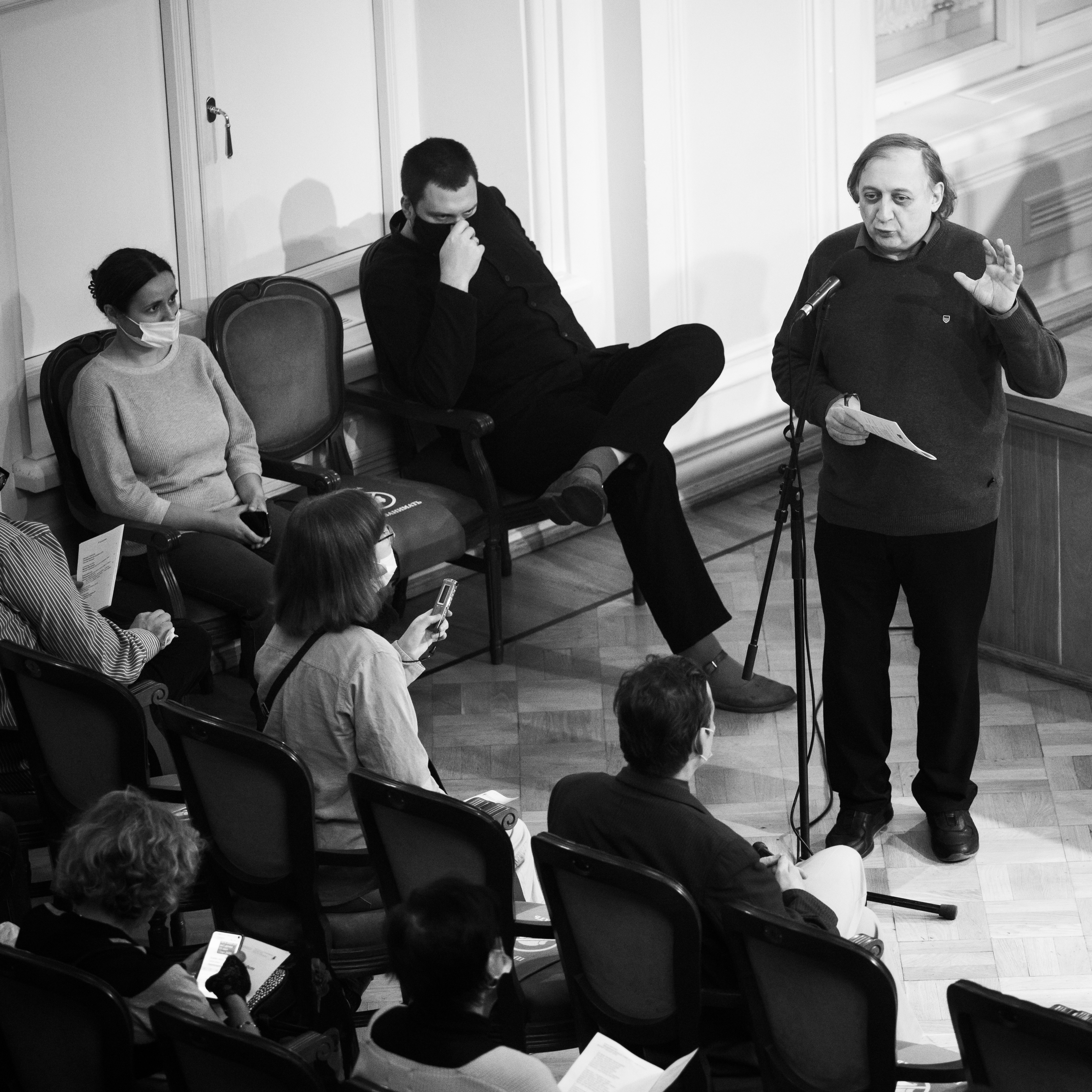 Это был первый после снятия карантинных ограничений офлайновый вечер «Студии новой музыки». Александр Вустин и Дмитрий Смирнов – яркие представители московской Ассоциации современной музыки II – погибли от коронавирусной инфекции в апреле этого года. С обоими мне посчастливилось общаться по профессиональным поводам: мы делали интервью, я писала рецензии и даже целую главу о творчестве Александра Кузьмича в диссертации. Смирнов давно переехал в Англию, а Вустин жил и работал в Москве, поэтому с ним мы общались больше и, наверное, можно даже сказать, были близкими друзьями. Вустин – один из немногих композиторов, кого можно было запросто встретить на концертах современной музыки вне зависимости от того, исполнялось его сочинение или нет. Он всегда был включенным в музыкальную жизнь Москвы, причем это касалось не только новой академической, композиторской музыки. Однажды мы ходили в бутмановский «Ле Клуб» послушать польского саксофониста Збигнева Намысловского, в другой раз – в Культурный центр «Дом», где выступал нидерландский новоджазовый перкуссионист Хан Беннинк. И вот сейчас, когда Александр Вустин отсутствовал в зале, где исполнялись его сочинения, возникало иррациональное чувство присутствия. На галерке были замечены его коллеги и друзья по Ассоциации современной музыки – Виктор Екимовский, Владимир Николаев, Иван Соколов, Юрий Воронцов, Фарадж Караев, Рауф Фархадов… Зал был практически заполнен – правда, в шахматном порядке, и теперь, похоже, к этому придется привыкать.