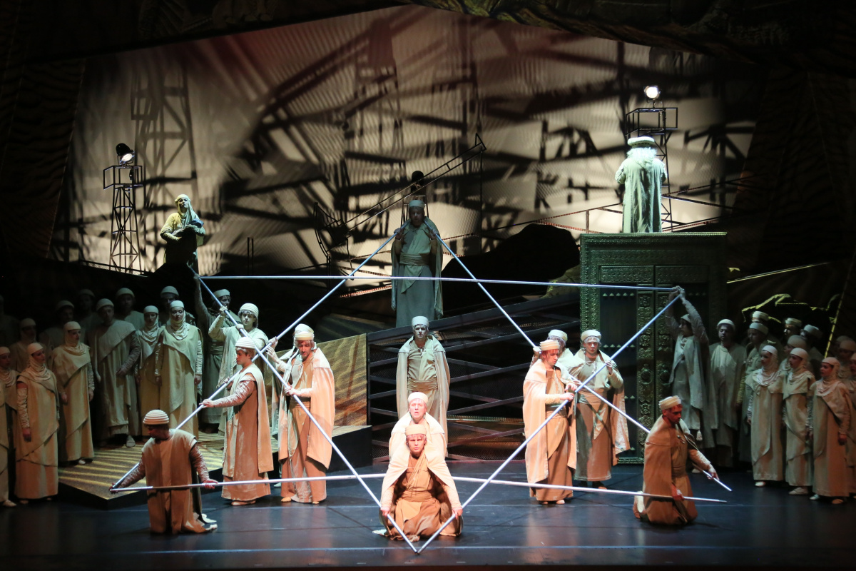 Геликоновский «Набукко» это визуально красивый, весьма традиционный, по большей части условно исторический спектакль. В нем на фоне песчаных барханов Междуречья, узнаваемых ассиро-вавилонских барельефов и пронзительно синего южного неба разворачивается хрестоматийная история о противостоянии добра и зла, смиренной, но пылкой и мужественной веры и тирании и безграничного тщеславия. Противостояние дано весьма дидактично: ассирийцы в черном – иудеи в белом. Еврейская сакральная тематика педалируется: тут вам и звезда Давида, которую складывает хор из длинных копий на Va pensiero, и семь свечей, и т.п. Не обошлось и без маркеров постмодерна: иракскую тематику (актуальную в начале 2000-х после свержения Саддама Хусейна) навязывают зрителю «уместные», как вставная челюсть, беспрестанно работающие нефтяные станки-качалки, а злодейка Абигайль не только внешним видом (в особенности рыжими кудрявыми волосами), но и ухватками сильно смахивает на Аллу Пугачеву.