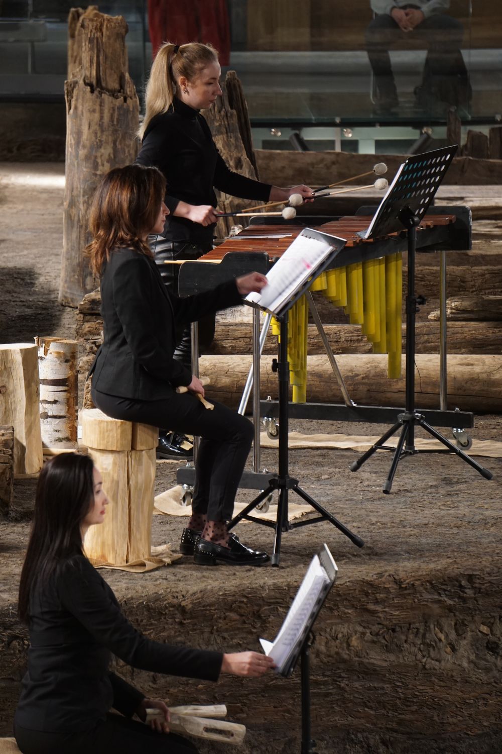 В исполнении принимали участие прекрасные музыканты: вокальный ансамбль – Элиза Насырова, Аделия Закирова, Ксения Романова, Галия Газизова, Анастасия Чупрунова, Андрей Оводов, Максим Пронин, Ильдар Шамсутдинов, Нияз Ярулин – во главе с Миляушей Таминдаровой (те же солисты-вокалисты также извлекали не нотированные, но предусмотренные композитором звуки из вудблоков и даже из бревен с помощью… топоров), на ксилофонах играли Ксения Калинина и Алексей Анисимов, на маримбе – Дарья Петрова.