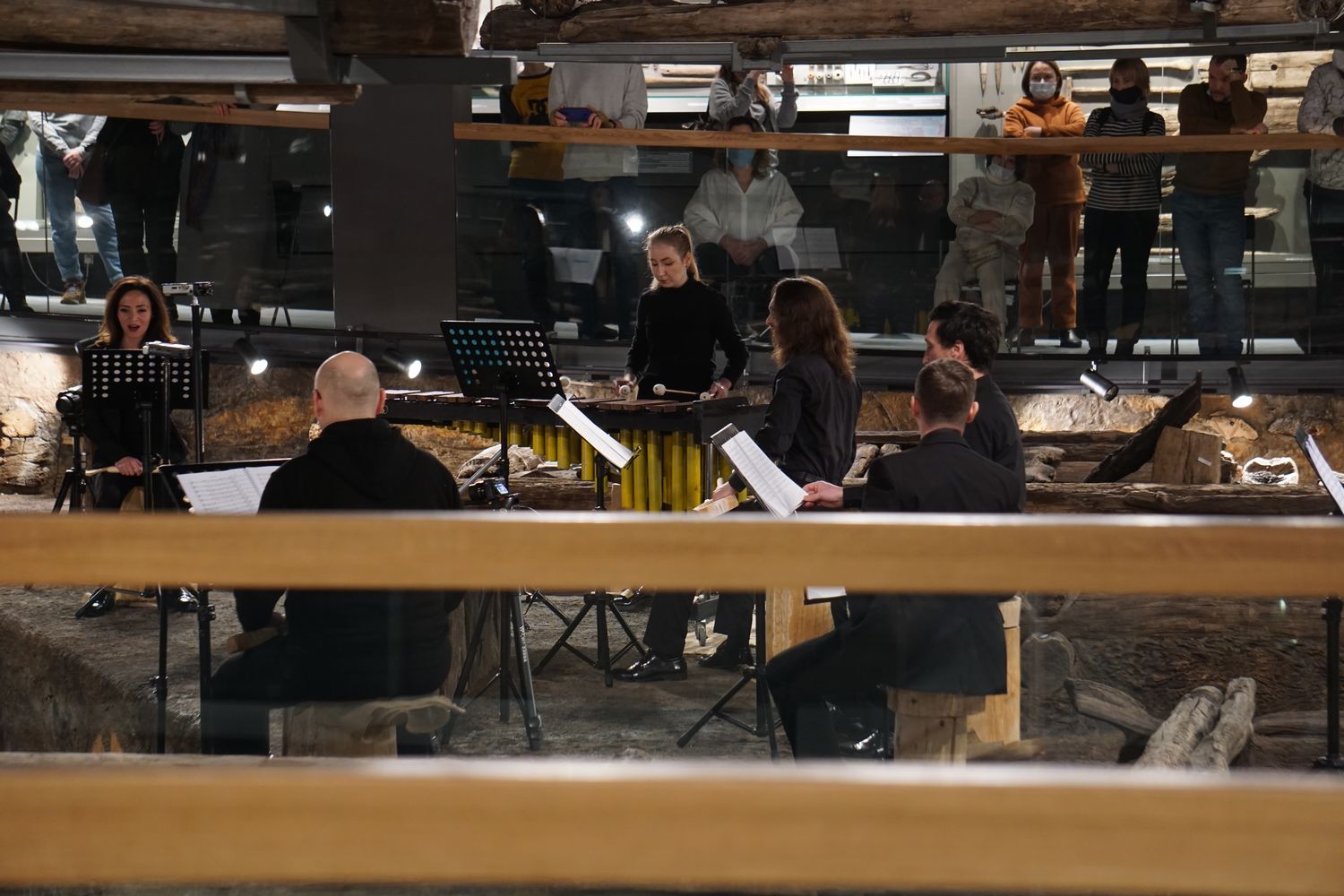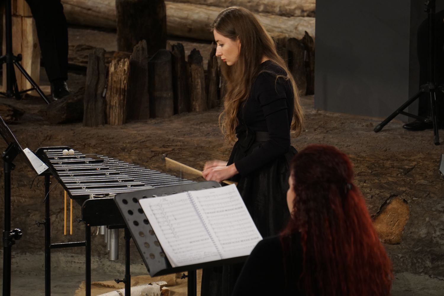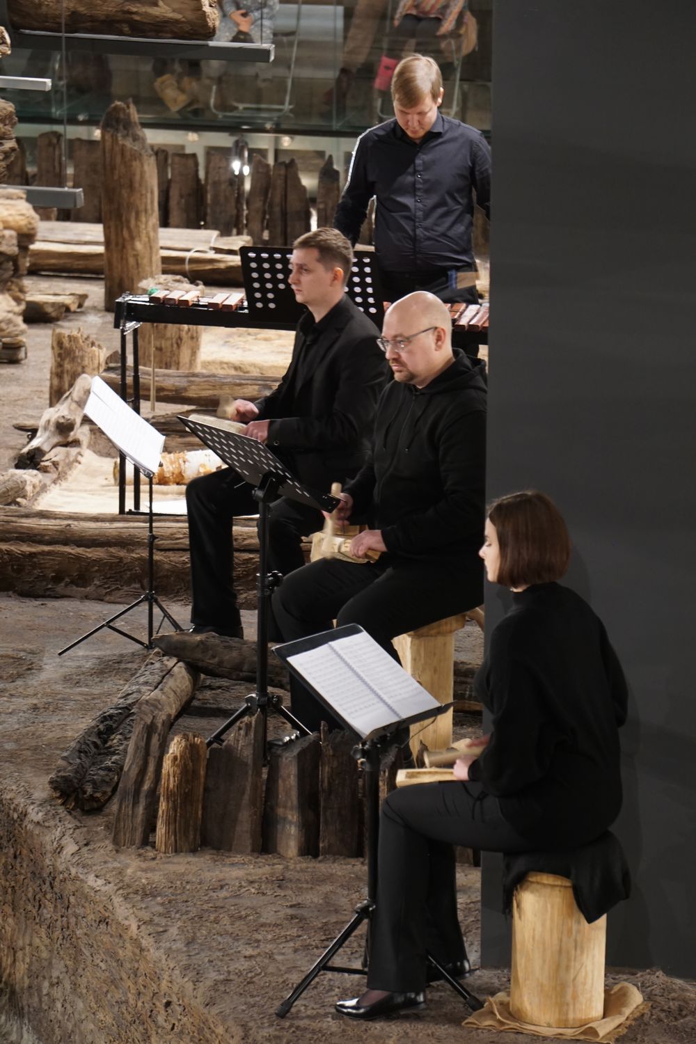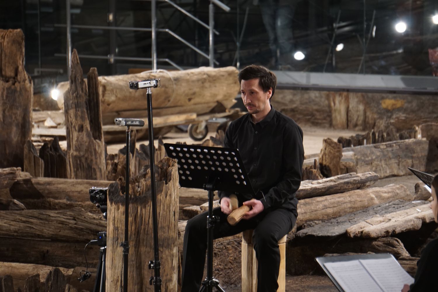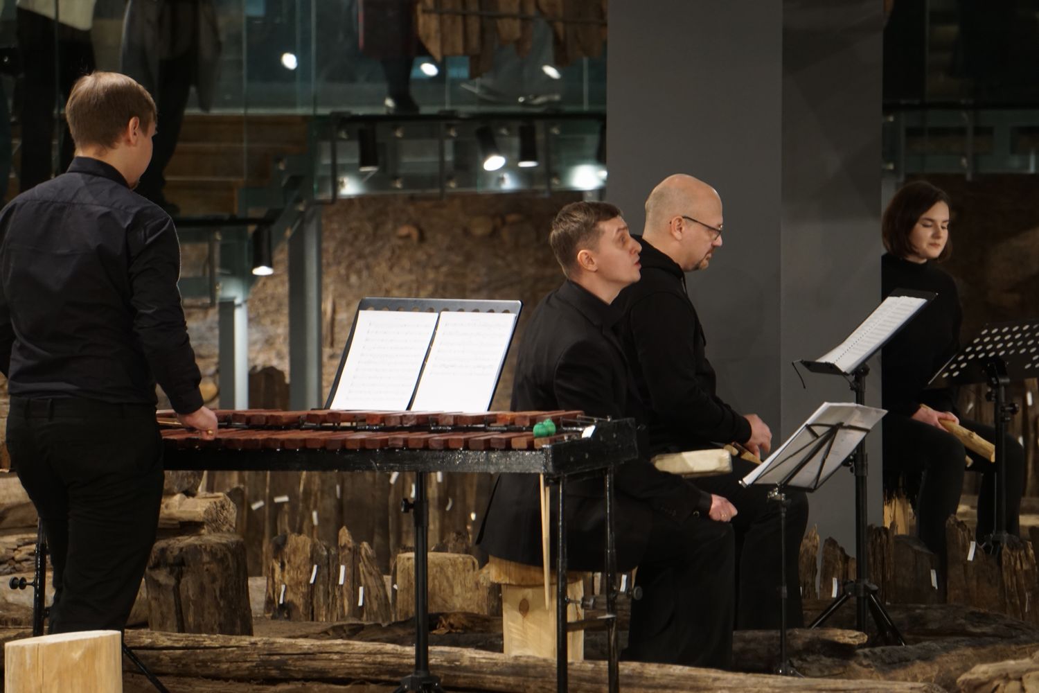 «Конец времен» написан для небольшого вокального ансамбля и перкуссии (два ксилофона, маримба и несколько деревянных вудблоков, изготовленных специально для этого случая Артемом Силкиным – мастером на все руки). Исполнители располагаются на нижнем, подземном уровне, прямо внутри сохранившегося древнего раскопа посадской части Свияжска, вокруг которого и сформирована музейная экспозиция, среди срубов домов и хозяйственных построек, фрагментов заборов и деревянных мостовых. Все это, помимо аутентичной атмосферы, дает еще и особый резонанс. Ни один звук в этом пространстве не теряется, но, напротив, приобретает стереофонический объем. Недаром партитура во многом и создавалась в расчете на здешнюю специфическую акустику.