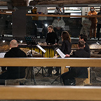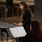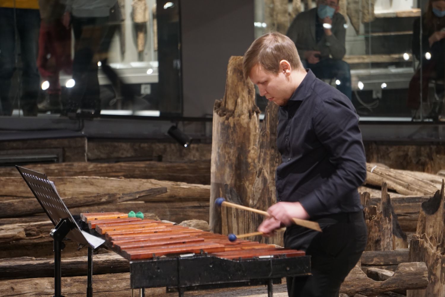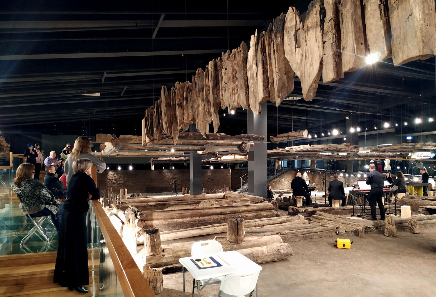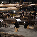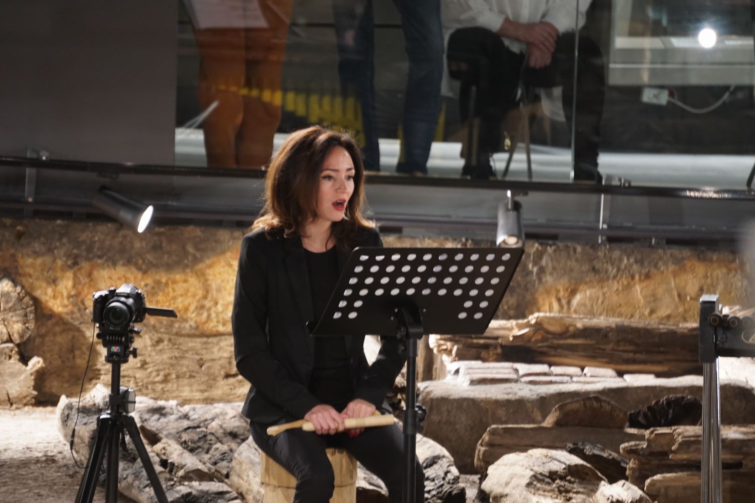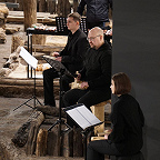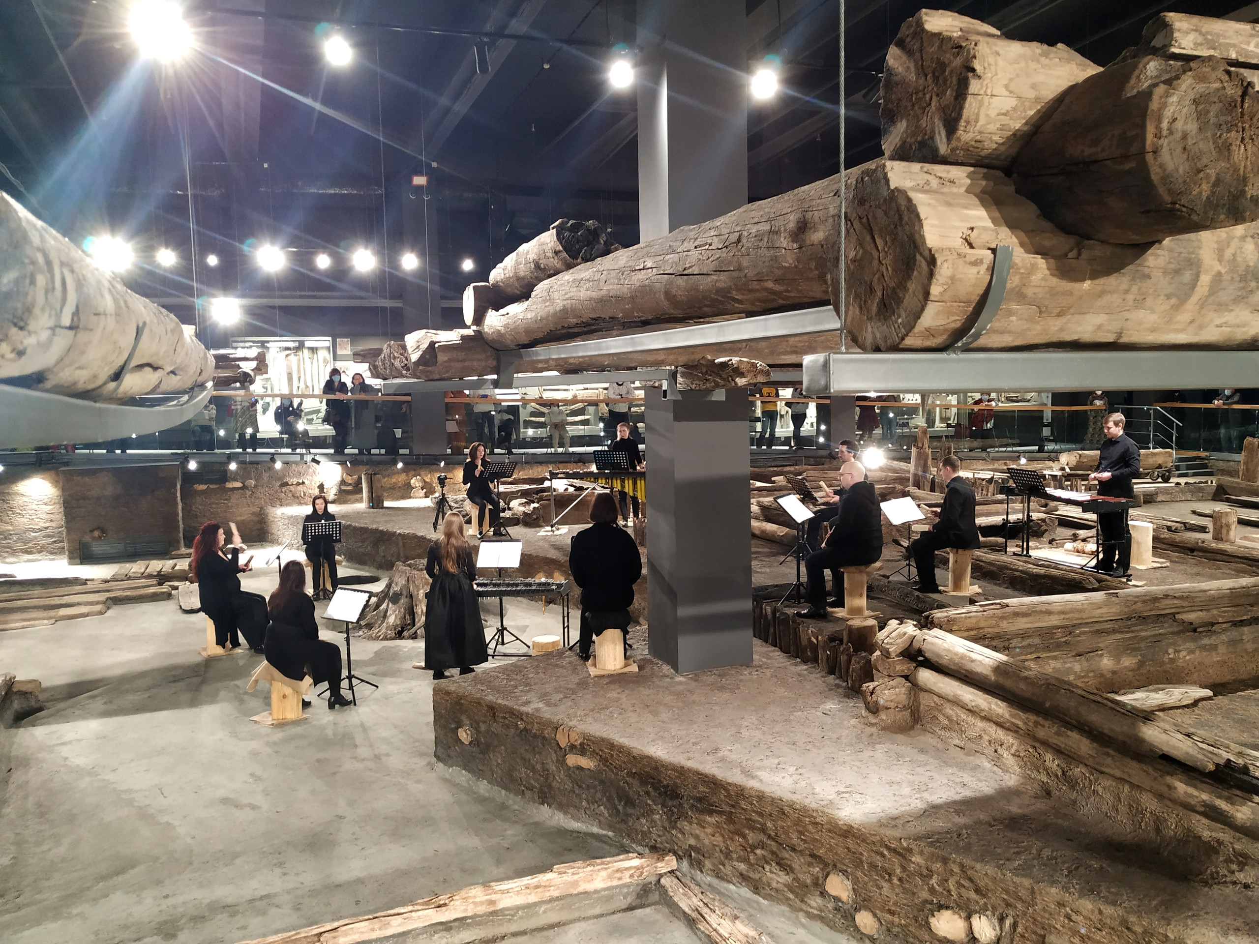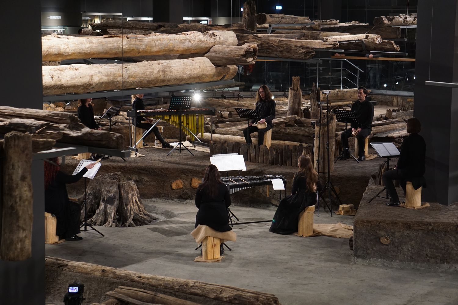 «Конец времен» написан для небольшого вокального ансамбля и перкуссии (два ксилофона, маримба и несколько деревянных вудблоков, изготовленных специально для этого случая Артемом Силкиным – мастером на все руки). Исполнители располагаются на нижнем, подземном уровне, прямо внутри сохранившегося древнего раскопа посадской части Свияжска, вокруг которого и сформирована музейная экспозиция, среди срубов домов и хозяйственных построек, фрагментов заборов и деревянных мостовых. Все это, помимо аутентичной атмосферы, дает еще и особый резонанс. Ни один звук в этом пространстве не теряется, но, напротив, приобретает стереофонический объем. Недаром партитура во многом и создавалась в расчете на здешнюю специфическую акустику.