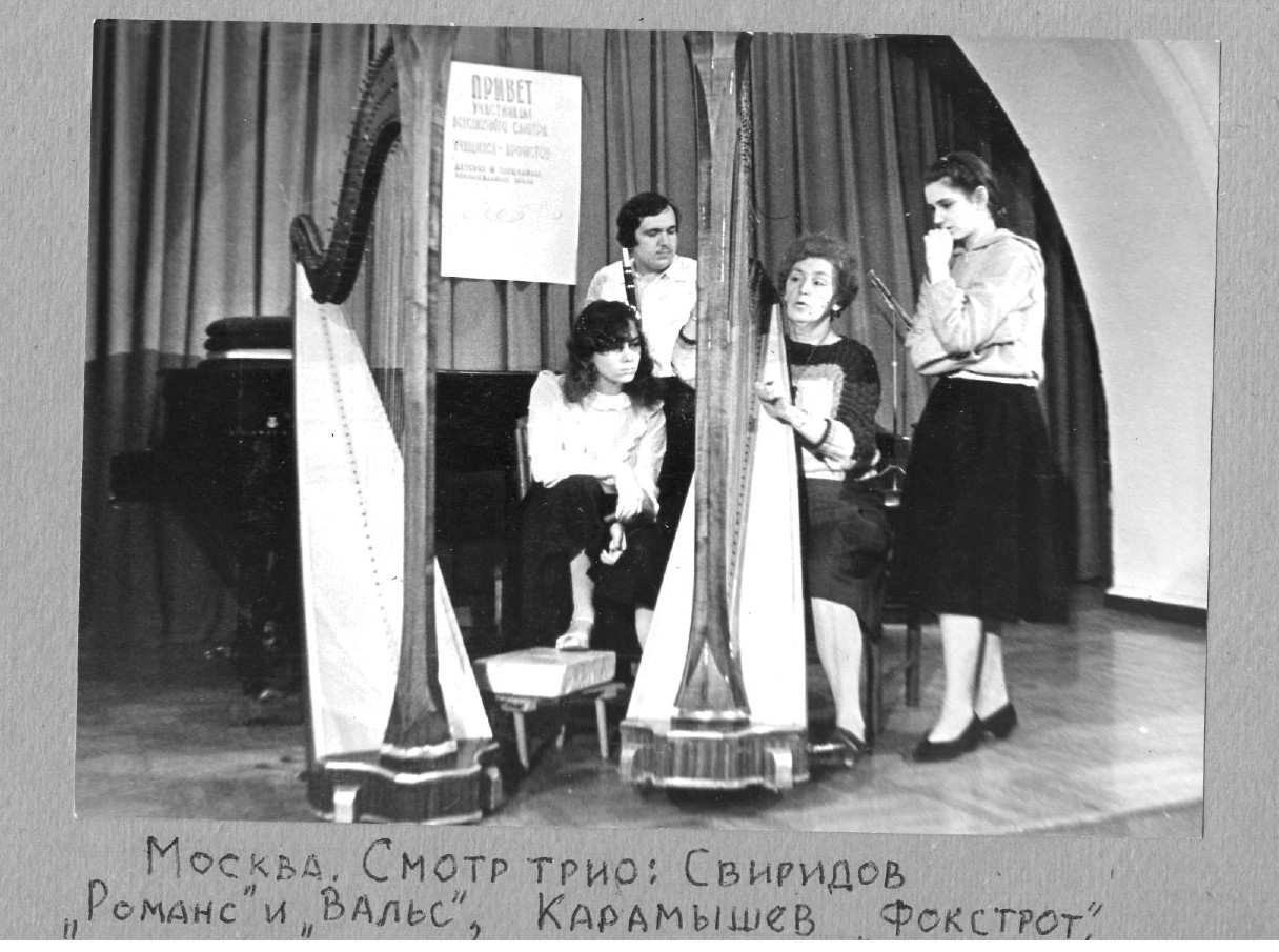 - После окончания музыкального училища и консерватории по классу Е. А. Синицыной в 1959 году, у меня началась активная концертная жизнь. У меня был инструмент, поэтому и работы было много – играла с гастролирующими музыкантами: театр «Эстония», Одесская оперетта, театр «Ромэн», аккомпанировала Георгу Отсу, выступала с оркестрами во Дворцах культуры, меня постоянно приглашали на разовые выступления в Александринский и Мариинский театры.Была большая профессиональная работа в Капелле: мы играли целый цикл интереснейших произведений ансамблем, в составе которого были голос, орган, арфа и скрипка. Исполняли «Аве Марию» Баха, «Как дух Лауры» Листа, «Лебедь» Сен-Санса (мало кто знает, что в этом произведении есть текст и вокальная партия). Это было огромное счастье и творческое удовлетворение – выходить на исторические сцены нашего города в роскошном концертном платье (а у меня оно было необыкновенное, доставшееся от маминой тети, переливающееся, расшитое бисером) и играть с настоящими профессионалами высокую классику. Но… постоянной работы у меня не было. Был кружок рояля во Дворце культуры им. Кирова Васильевского острова, который я вела, но мне это было откровенно неинтересно. Я постоянно искала возможности все больше работать с арфой, и однажды пришло озарение: почему бы не открыть класс арфы? С этой идеей я пришла к директору школы, Марии Валерьяновне Ершовой, которую я знала еще с довоенных лет. Она ответила лаконично: найдешь арфу – откроем. И я отправилась искать. В консерватории чудесный наш мастер подобрал мне списанную арфу, которую на фабрике имени Луначарского помогли отремонтировать, и 1 сентября 1963 года открылся наш класс. Надо сказать, что наша школа была одной из немногих в Петербурге, где издавна существовал класс арфы. Нам удалось его возродить, и я считаю это одним из самых главных своих достижений.