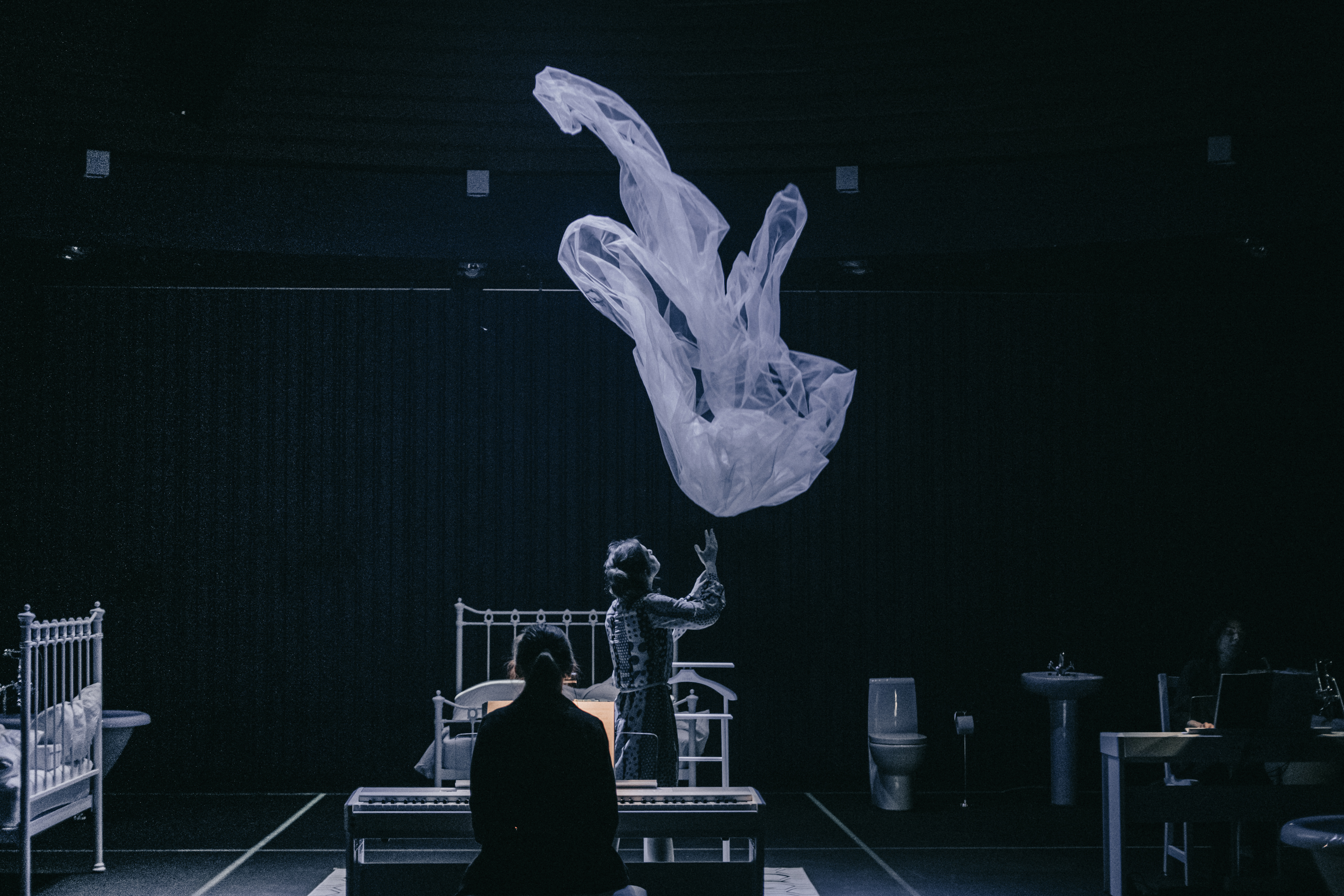 Сила этого спектакля в отлично организованном при участии художника Ксении Перетрухиной пространстве –сложном, открытом зрителям с трех сторон (его ритмизируют три фортепиано, три кровати, три ванны и хорошо просчитанное соотношение белого и черного). Слабость спектакля –в недостатке актерской органики, считывающейся на расстоянии вытянутой руки в минуту.