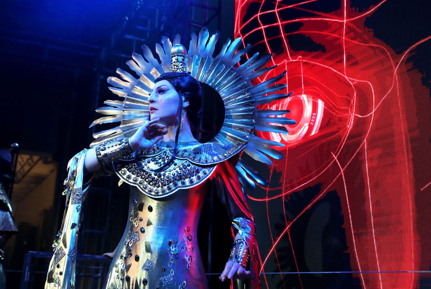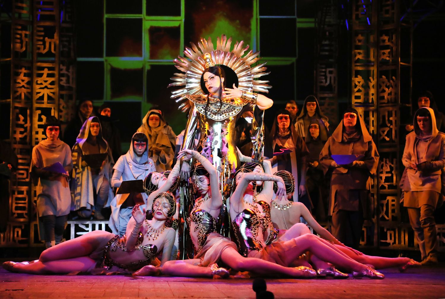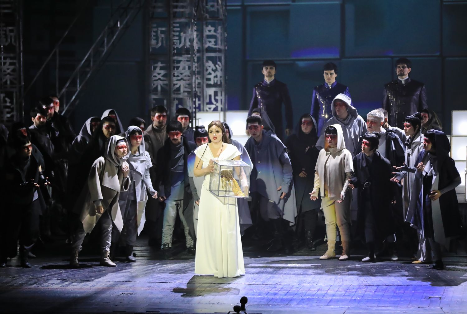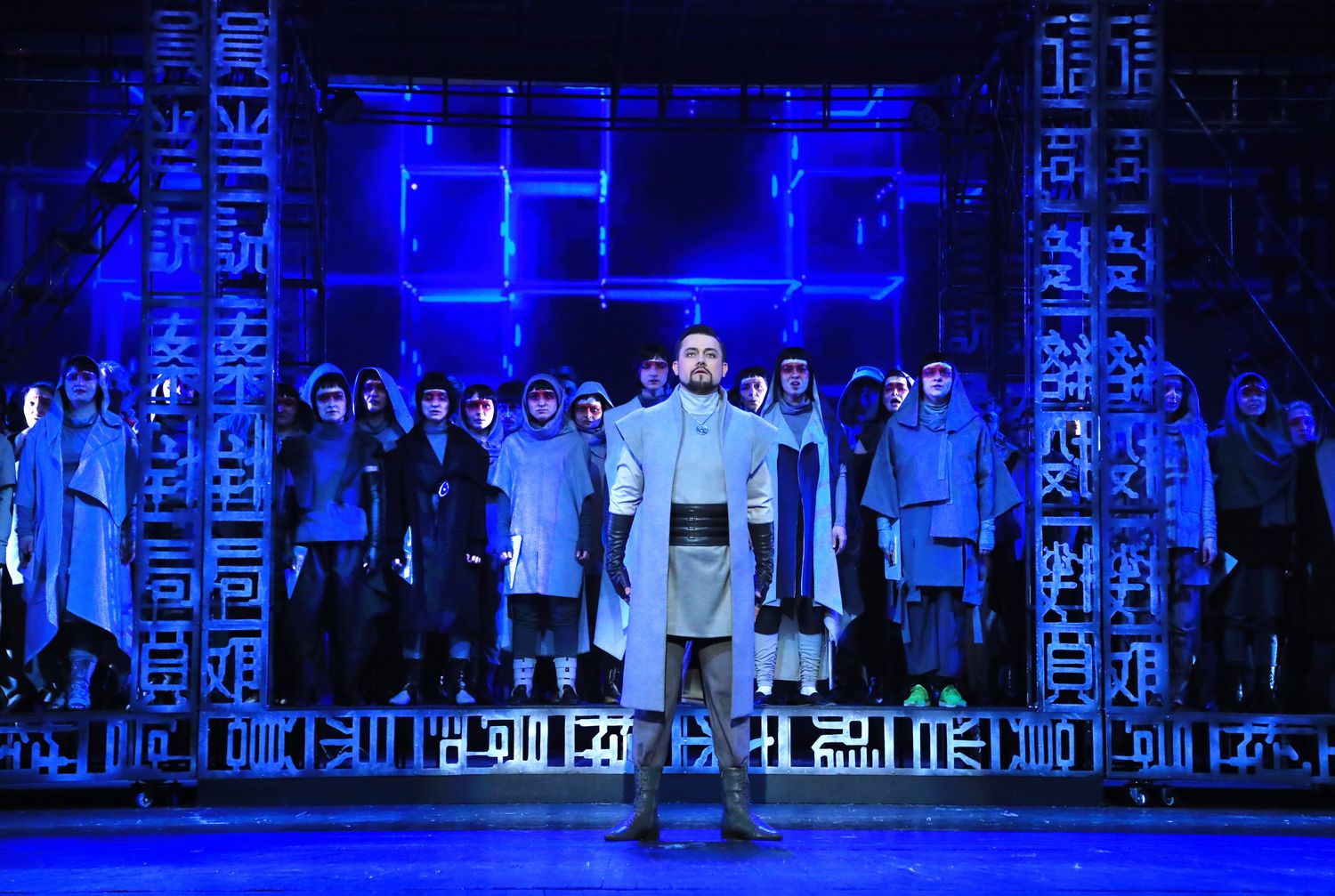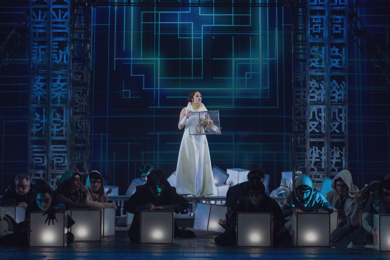 Спектакль главного режиссера Ростовского музыкального театра Павла Сорокина далек и от радикальных крайностей, и от упомянутой гигантомании большого оперного стиля. Нет в нем и набившей оскомину квазикитайской вампуки – хотя элементы «китайщины» в сценическом решении, конечно, присутствуют. При этом, в отличие от многих современных версий, где действие отнесено поближе к нашим дням, в Ростове все происходит в будущем. Но перед нами – не антиутопия.