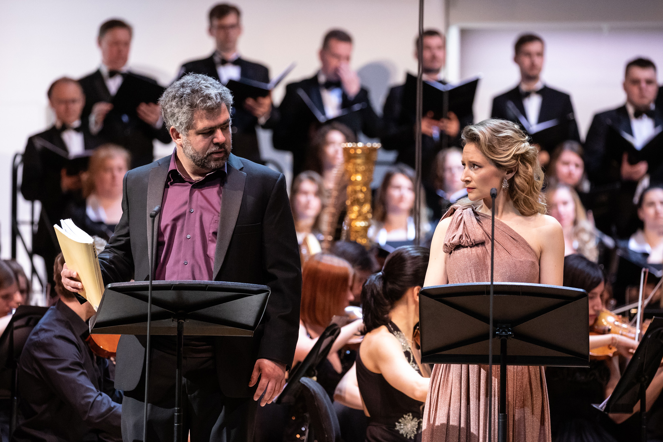 Коллективный участник исполнения – Российский национальный молодежный симфонический оркестр оставил приятное впечатление слаженностью и эмоциональностью. Он выступил под управлением Роберта Туои: ирландский маэстро представил партитуру ярко и драматургически убедительно, был внимателен к вокалистам. «Мастера хорового пения» Льва Конторовича тоже были в основном на высоте, хотя при стройности звучания и его впечатляющей красоте было заметно, что французский язык не является сильной стороной коллектива.