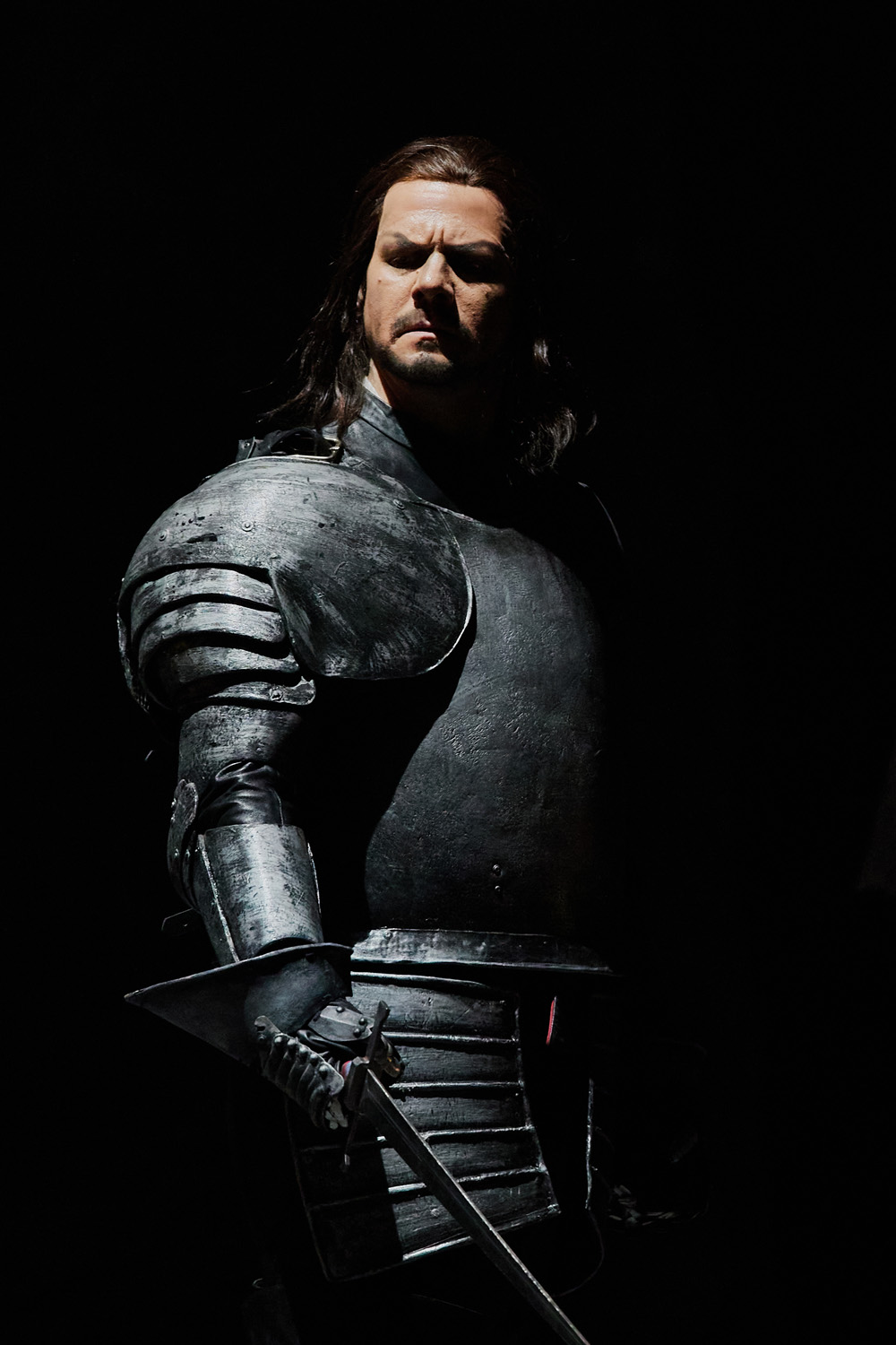 «Макбет» 2001 года британца Дэвида Маквикара (сценограф Таня Маккаллин, свет – Дэвид Каннингхем) подчеркнуто мрачен и историчен. Темная кладка стен и величественные арки, зияющие разорванными дырами на теле спектакля, свисающие гроздьями трупы и закованное в латы, снабженное пиками и алебардами шотландское воинство – все говорит о «темных веках». Средневековье, конечно, условное и не такое уж древнее, как хотел Шекспир (XI век): судя по костюмам – времена самого драматурга и его патронессы «доброй королевы Бесс». Костюм и прическа Леди Макбет, в которую уложены ее огненно-рыжие пряди, вызывает в памяти канонический образ Елизаветы Тюдор, а вовсе не Груох, супруги преступного Макбета.