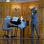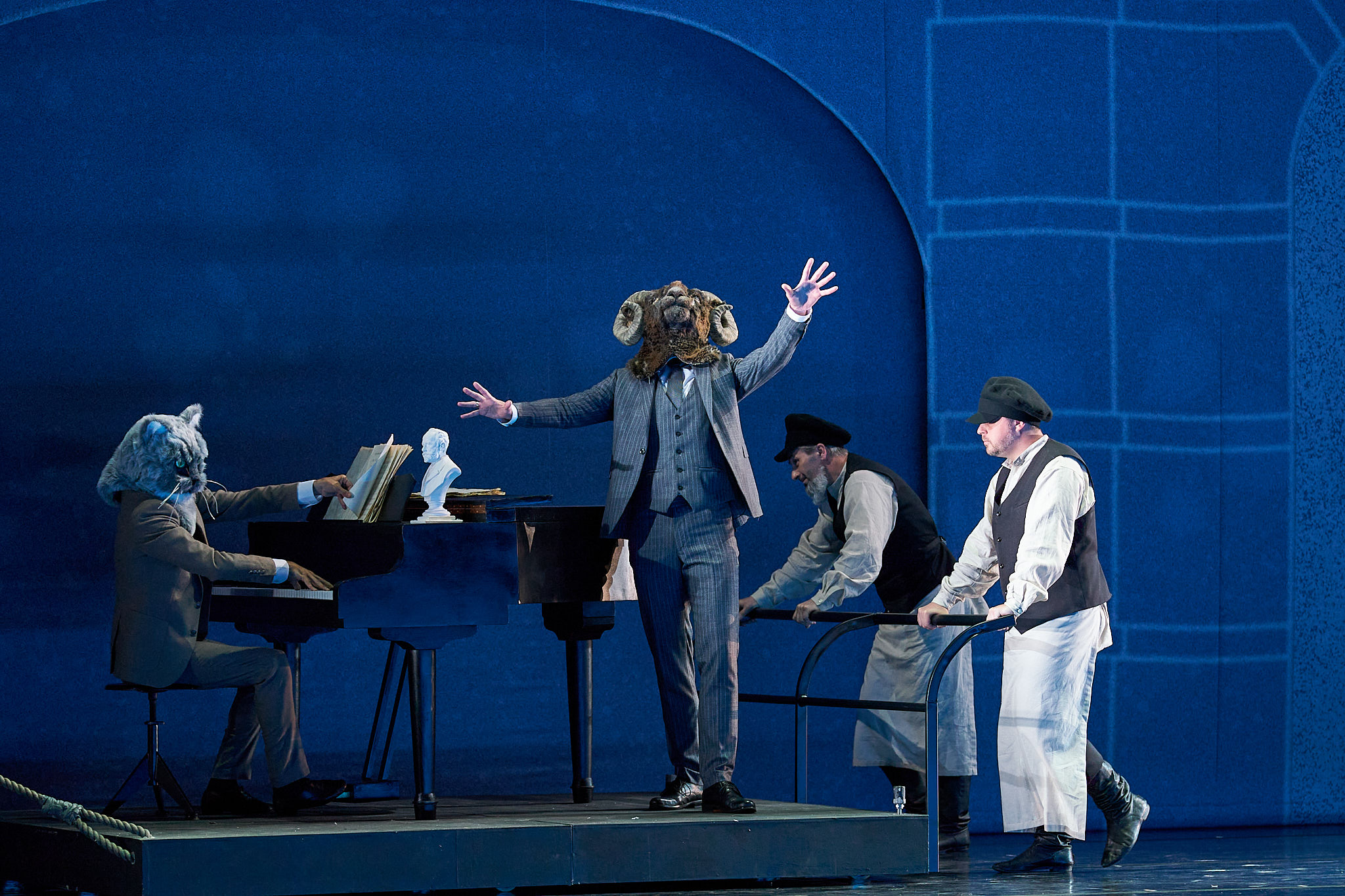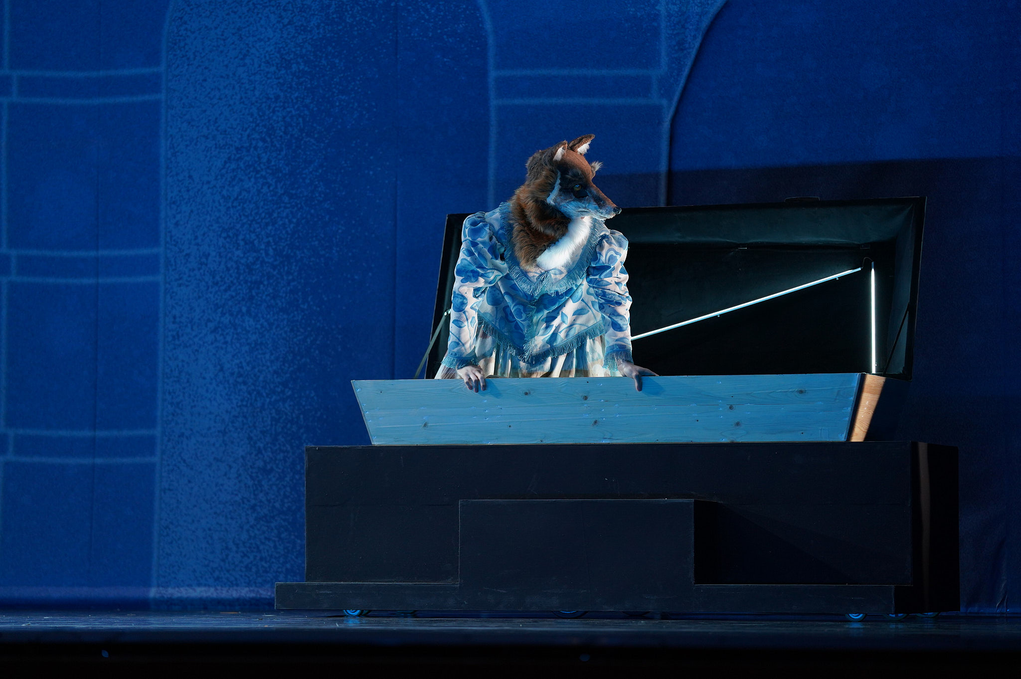 Эти же двое фигурируют и в «Байке» наряду с примерно таким же, как и в «Мавре», количеством танцовщиков, а также еще одним сквозным образом – Лисы, которая со скоростью ракеты носится по сцене и пугает всех и каждого. В «Байке» планшет сценического зеркала уже не голубой, но тоже имеет четыре окошка. Первое – студия звукозаписи, где в наушниках и у микрофонов ворожат вокалисты (тенора Александр Тимченко и Александр Трофимов, басы Ярослав Петряник и Юрий Власов). Второе – репетиционная, где композитор за роялем работает с солистами. Третье – приют хореографических миниатюр; четвертое – анимация с движущимися фигурками животных из лубочных иллюстраций к сказкам (работа Юлии Гильченок и Сергея Рылко). Действие полифонично, у зрителя, который должен еще читать титры с пропеваемыми текстами, буквально идет голова кругом от потока разнородной информации. Нельзя сказать, что между динамизмом и живостью, с одной стороны, и возможностью прочувствовать и понять все нюансы, настроения, краски, эмоции, с другой, соблюдена мера. И «Байка», и «Мавра» стремительно проносятся перед изумленной публикой, у которой от этой чехарды остается лишь одно устойчивое ощущение – сущий балаган! Но, собственно, этого и добивался Игорь Стравинский, апеллируя в своем творчестве именно к скоморошье-площадному, лубочному народному театру. Борис Асафьев когда-то справедливо назвал все это «ренессансом скоморошничанья» и «подлинного старосветского русского театра», Ричард Тарускин – «не возрождением, а изобретением». А значит, новые работы Мариинки бьют точно в цель!
