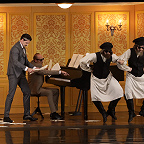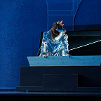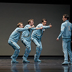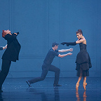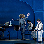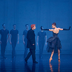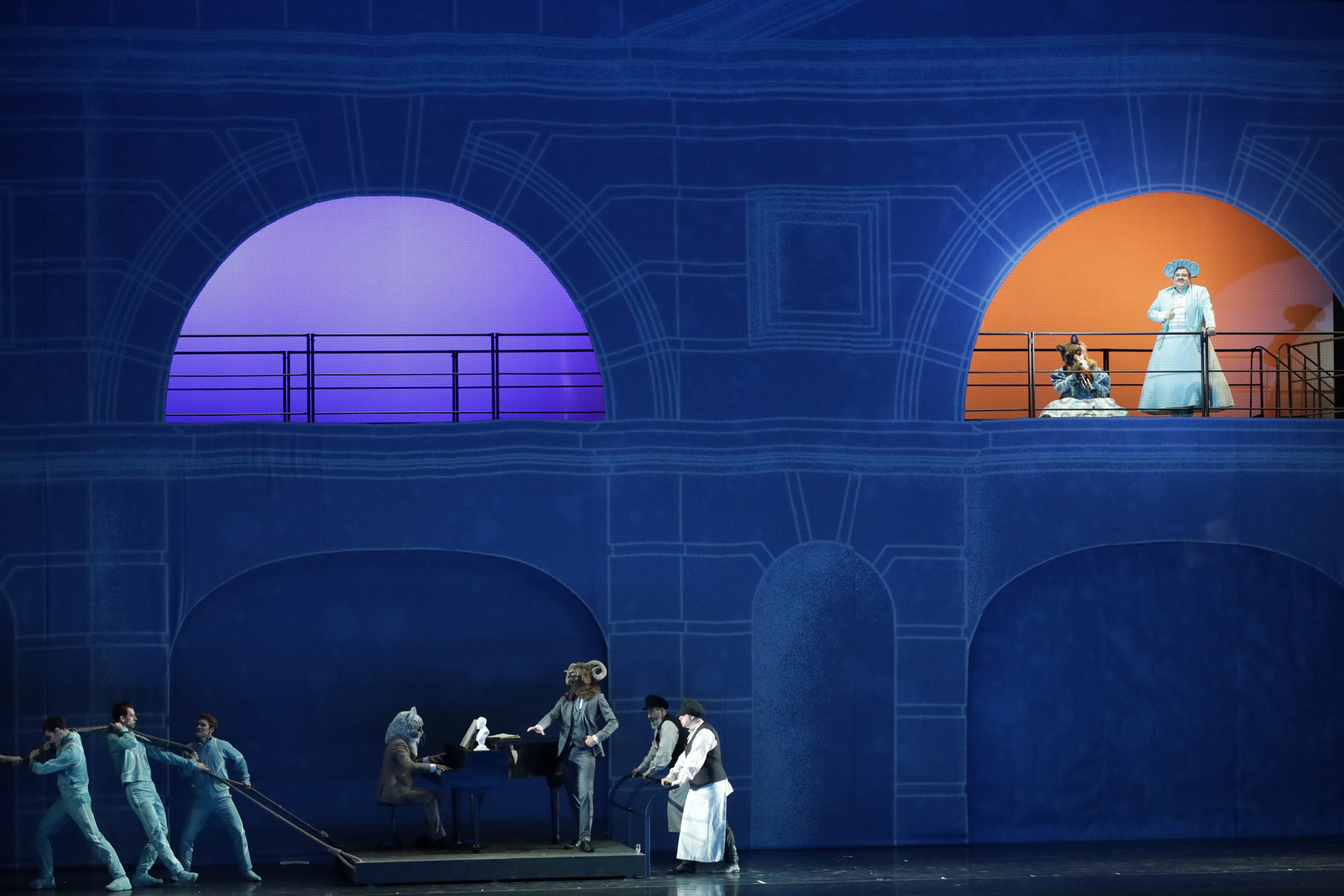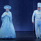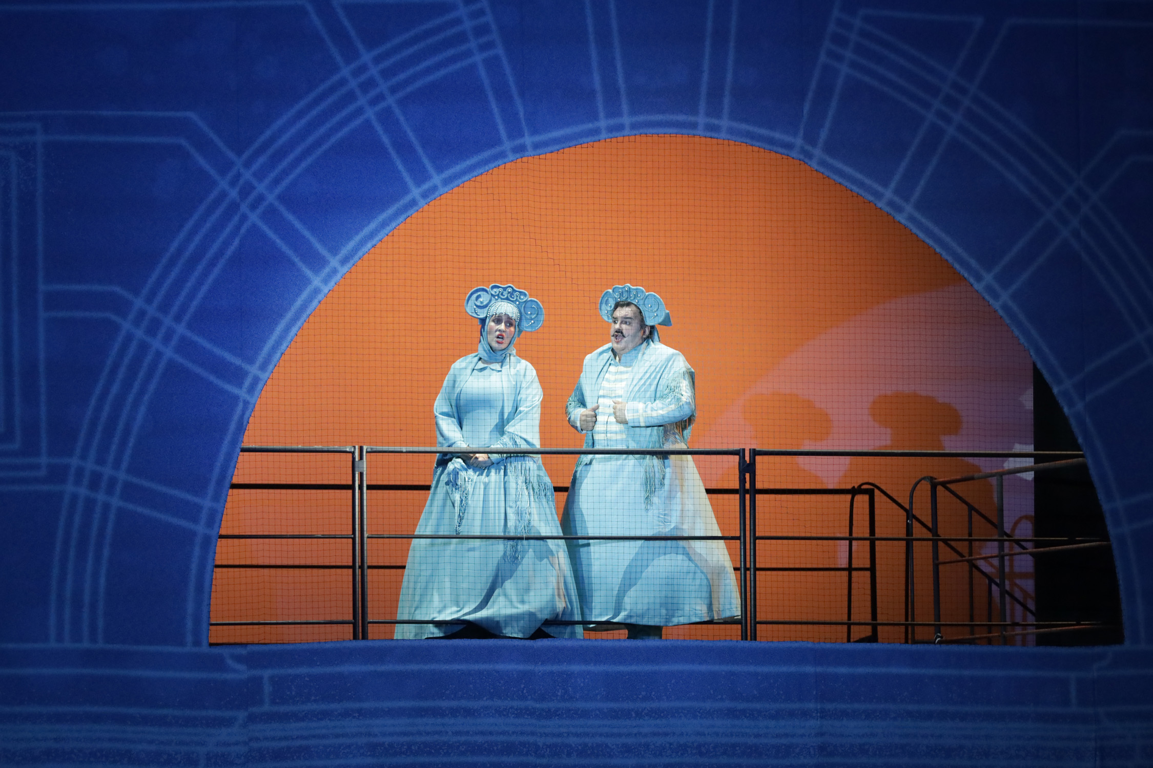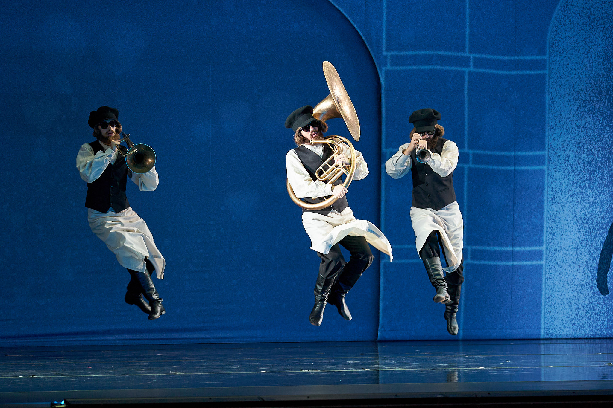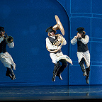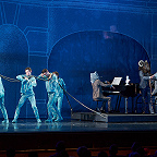 За единый стиль и концепцию отвечал хореограф Максим Петров, решивший все три произведения в чисто балетном преломлении. И если для «Поцелуя» это естественно, для «Байки» тоже нормально (певцы здесь – лишь акустические иллюстраторы, исключенные из действа), то для «Мавры» до известной степени необычно. Затянутое в голубые тона пространство (сценограф Альона Пикалова) представляет собой некий планшет во все зеркало сцены, в вырезанных окошечках которого, словно в теремных оконцах-прорезях, появляются статичные солисты и вокализируют, мало двигаясь и мало взаимодействуя между собой. Они напоминают фигурки дымковской игрушки или, скорее, даже гжели, на которые мы любуемся, но от которых не ждем никакого драматизма – вся их история заключена уже в их внешнем виде. Голубые костюмы квартета солистов (Параша – Елена Стихина, Гусар – Евгений Акимов, Мать – Анна Кикнадзе, Соседка – Екатерина Крапивина) делают певцов едва различимыми на фоне сценографии, все вместе воспринимается как некая инсталляция по мотивам петербургских печных изразцов. Комическая опера по определению должна содержать экшн – в ее забавных ситуациях вся суть. Однако в обалетизированном варианте Мариинки роль активного начала отведена танцовщиками – пятнадцать танцовщиц и танцовщиков то водят хороводы, то метут улицу в образах бородатых дворников в картузах, и т.п. Две мимические фигуры – сам композитор и его заказчик-патрон Сергей Дягилев – дополняют постмодернистский ландшафт.