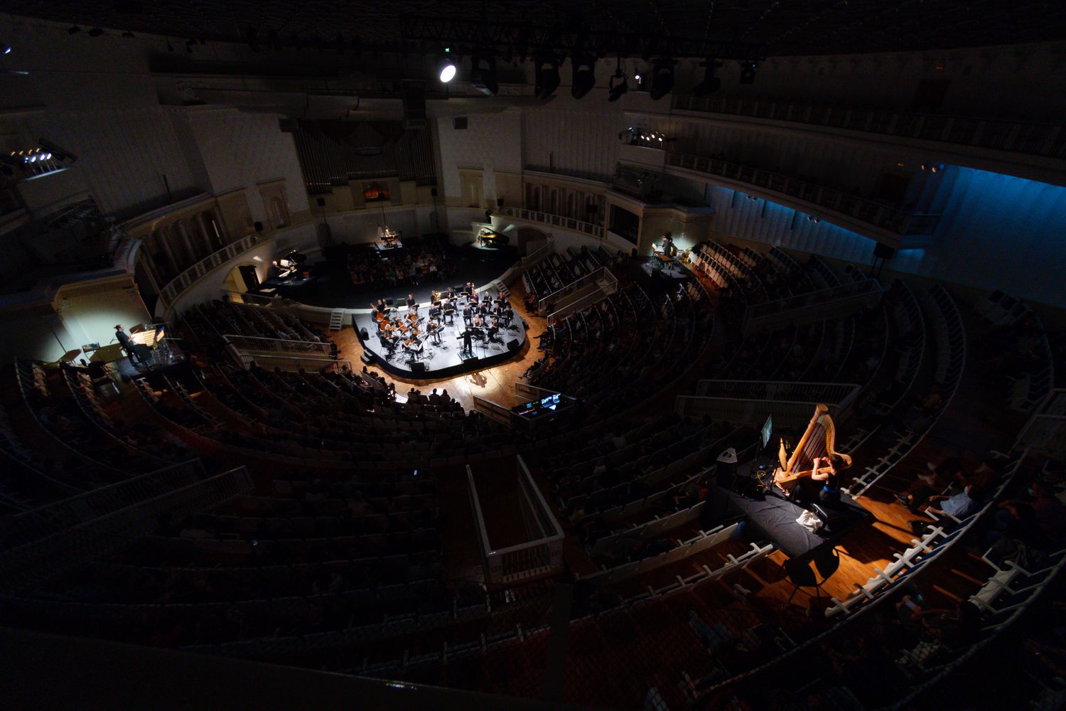 Программа, которую привезли парижане, была составлена из двух хрестоматийных для ансамбля опусов и двух новинок. Ее исполнение потребовало серьезной перестановки в зале, изящно подремонтированном к новому сезону. На месте партерных кресел выстроили платформу для музыкантов, часть зрителей получили места на сцене. Такая рассадка понадобилась для формирования уникального акустического пространства Repons. 24 музыканта должны были расположиться в центре зала, вокруг них – зрители и шесть колонок, а вокруг публики на возвышении – шесть солистов: два пианиста, арфист, цимбалист и два исполнителя на ударных (виброфоне и ксилофоне). Звуки инструментов в реальном времени преобразовывала живая электроника.