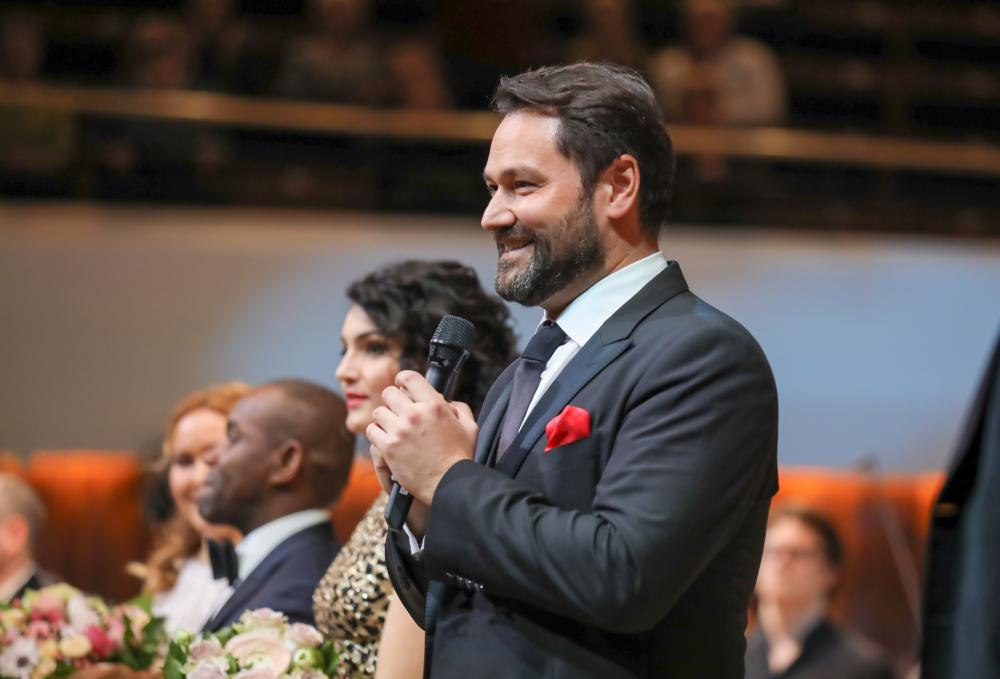 Ильдар Абдразаков ярко и выразительно спел фрагменты из своих коронных ролей – моцартовских Фигаро и Лепорелло, россиниевских Дона Базилио и Мустафу, продемонстрировав бас европейского типа: мягкий, пластичный, уверенный наверху и не слишком увесистый в нижнем регистре. За счет тембральной насыщенности его голос не назовешь легким, однако и басовитостью в русском смысле он все же не обладает – впрочем, в избранном репертуаре она и не особо нужна. Помимо вокальной безупречности Абдразаков пленял ненарочитым, естественным артистизмом – каждый его персонаж оказывался очень живым и точным, очерченным всего несколькими штрихами, но абсолютно узнаваемым.