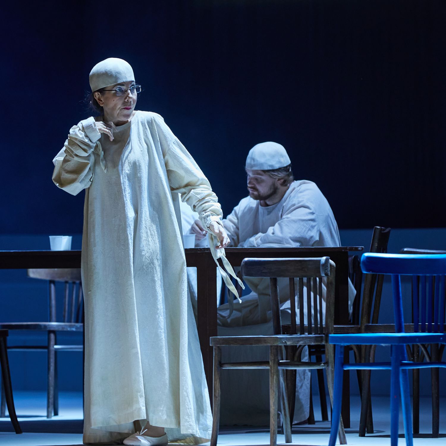 Сценограф Иманоль Персе не сильно себя утруждал: все три акта сцена остается совершенно пустой. На фоне белесого задника стоят белые станки, на которые иногда взбирается хор, чтобы подобно комментатору в античных трагедиях что-то поведать «городу и миру». Лишь в акте Антонии в центре оказывается рояль, за которым одержимая музыкой девушка проводит свои дни; в остальном же сценическое пространство Мариинки-2 почти стерильно. Тотальную белизну нарушают немногочисленные элементы реквизита и костюмы героев. Например, активно «маякуют» голубые волосы Гофмана или «кровоточащая» рубаха четырехипостасного злодея, золотистый брючный костюм Джульетты или скромное коричневатое платье Антонии, в которых, правда, белый цвет также частенько доминирует (особенно у массовки). Пустота и белизна изрядно утомляют. Некоторое разнообразие вносит свет Гидала Шугаева, однако назвать его интересным затруднительно.
