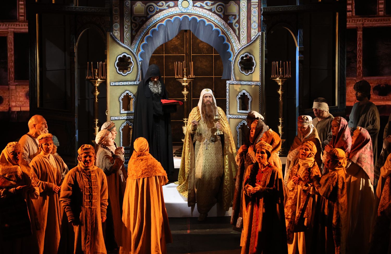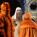 Далее Александр Соловьев взялся за исполнительскую сторону дела, и во многом преуспел. Звучание оркестра – хорошей выделки полотно, в котором основная «нить» – интеллигентность, проступавшая даже там, где необходимо было рвать и метать. И начинающему в «Опричнике» свой оперный путь Чайковскому это было к лицу. Команда солистов как один уверенно двигалась к поставленной дирижером цели: качественный вокал, пристальное внимание к смыслам, отличная артикуляция. Последнее давалось с наибольшим трудом. Но нашлись те, кто показал высший класс по части скульптурности слова, – это Антон Пузанов, выступивший в короткой партии престарелого претендента на руку героини, и Алексей Тихомиров в партии злодея Князя Вязьминского. Достойно выглядела пара Сергей Кузьмин в роли протагониста и Валентина Феденева – Наталья. Но никто не сумел использовать вокальные средства для лепки образов лучше, чем Екатерина Егорова – Боярыня Морозова и Вадим Волков – Басманов. Они и обозначили противоположные нравственные полюса оперы, между которыми мечется герой (хотя Басманова ли видел на одном из них Чайковский – вопрос).