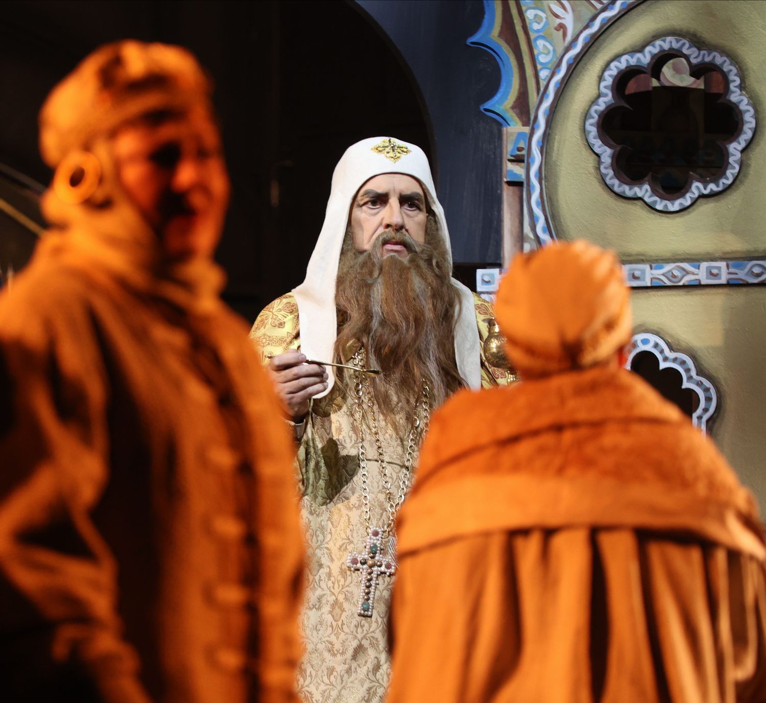 Резанет глаз черная орда в лиловых поясах, которые так любят католические прелаты, и накидках, похожих на фелонь, в каких служат православные священники. Это опричники. Дошедшие до нас изображения рисуют «униформу» членов этого своего рода монашеского ордена (во главе которого «игумен»-царь) иначе. Но ведь во сне может быть все что угодно. Хотя в этом логику уловить можно: скорее всего, художник искал обобщающий образ зловещей силы. Беда, что в театральной реальности эта костюмная фантазия – жирный перпендикуляр к ряду остальных костюмов, явственно тяготеющих к исторической правде в ее хрестоматийном виде.