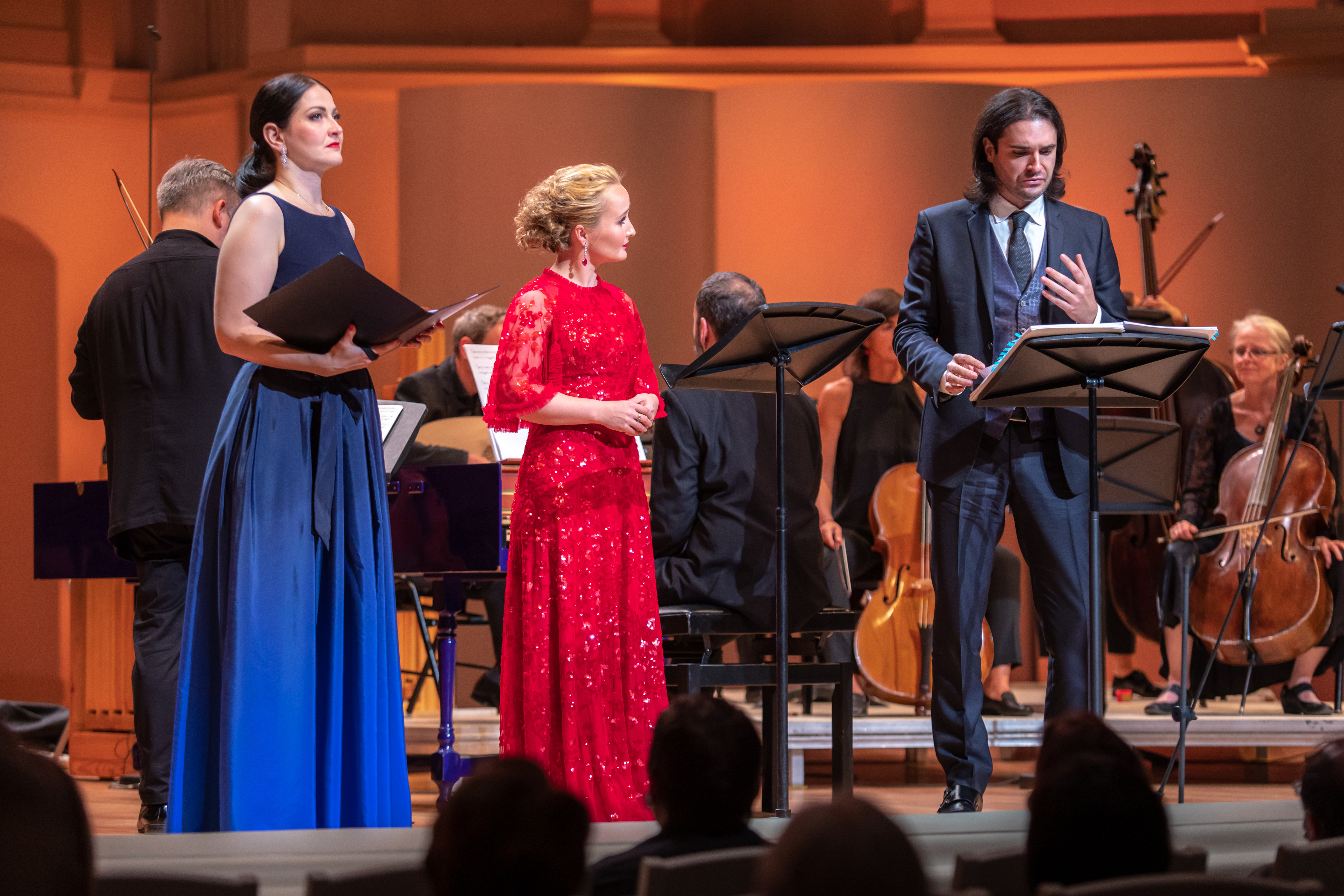 В международном квартете солистов аутсайдеров не было: и голоса, и качество исполнения радовали на протяжении всего вечера. Румынское сопрано Ана Мария Лабин исполнила партию Красоты. Ее легкий, щебечущий голос, гибкий и мягкий, идеально подходил для обрисовки образа, в котором главные краски – свет, радость, восторг, гармония. Особенно поразило исполнение трелей – легких, точных, журчащих, переливчатых. По-настоящему удивила Юлия Лежнева, представшая в образе Наслаждения. Ее пение было полно драматических красок, голос казался необычно насыщенным и тяжелым, властным и приторно-эротичным, при этом легкость в исполнении виртуозных пассажей и верхних нот не была утеряна. Единственный контратенор вечера, итальянец Карло Вистоли, убедил в контральтовой партии Разочарования. Конечно, и ему присущи некоторые недостатки, характерные для этого типа голоса в целом (резковатое звучание верхов, не всегда идеальная интонация и пр.), но они проявлялись в гораздо меньшей степени, чем у иных представителей цеха, а на первый план вышли красота альтового тембра, ровность голоса по всему диапазону и умение петь виртуозные украшения на очень качественном уровне. Конечно, было бы интересно послушать в этой партии настоящее контральто а ля Ева Подлесь – в этом случае генделевский замысел бы был воплощен полнее, и ансамбль голосов был бы полностью природно естественным. Но если сравнивать с выступавшими в Москве в этой партии контратенорами (Дэвидом Ди-Кью Ли, Дмитрием Синьковским и даже Василием Хорошевым, который в целом радовал), то Вистоли в наибольшей степени был на своем месте. Чилийский тенор Эмильяно Гонсалес Торо (Время) понравился и красивым тембром, и техническим уровнем, а в его интерпретации Время было неумолимым и жестоким – самый низкий голос ансамбля звучал местами даже брутально и жестко.