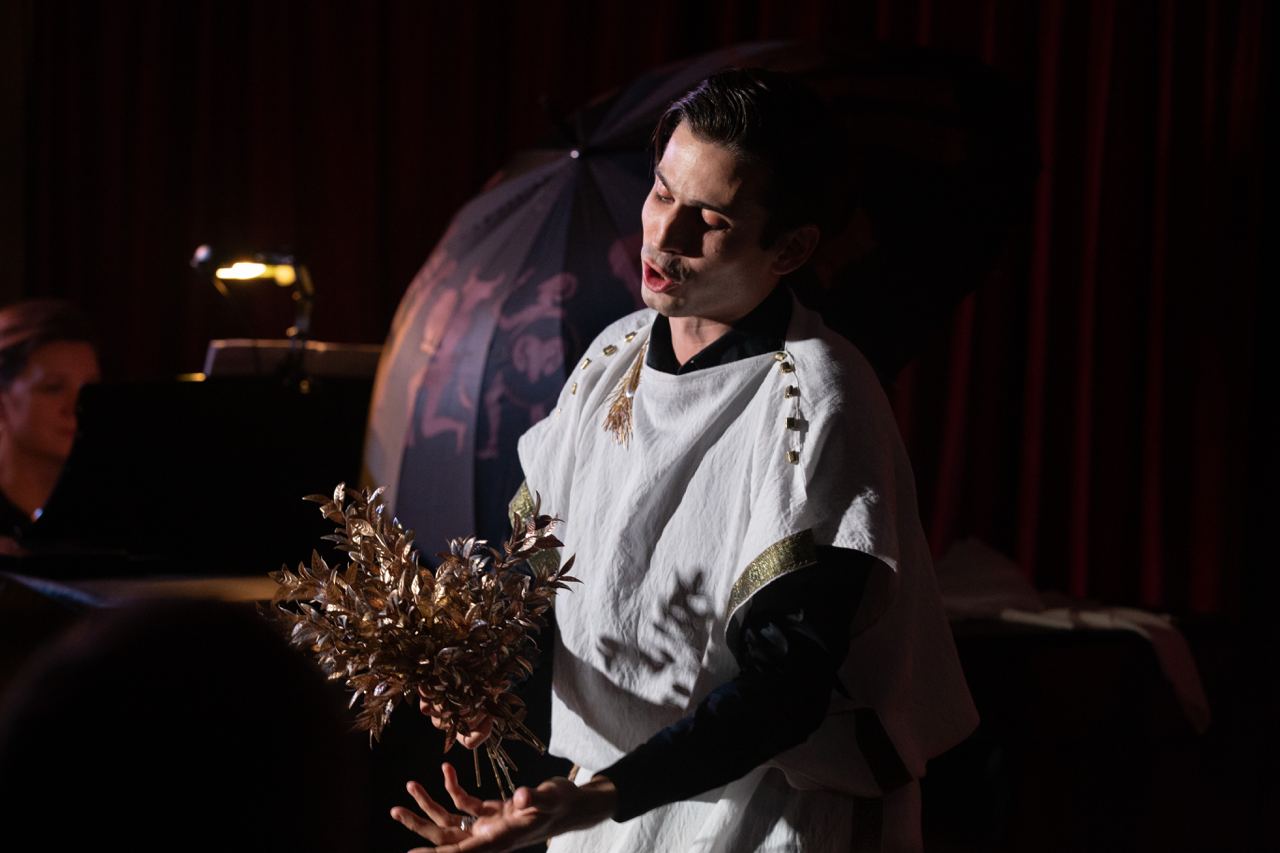 «Эвридику» представили в библиотеке-музее «Дом Лосева». Однако даже в этом крошечном зале артистам удалось разыграть настоящее театральное действо. Постановку вместе с Олегом Митрофановым (музыкальным руководителем и режиссером театра) осуществили художник Юлия Волкова, световик Константин Хромушин, хореограф Анна Некрасова и концертмейстер Наталья Мятиева. При невозможности развернуть полноценную сценографию главный акцент был сделан на пластике и мимике актеров, детальной проработке игры, вживании в образы. Огромна роль света и элементов реквизита, которые в небольшом помещении приобретают гипертрофированное значение: это венки, ветви растений, так или иначе ассоциирующиеся с орфической аркадией. В костюмах доминируют два цвета: черная основа и белые хитоны, имитирующие античные; иногда вторгаются элементы золота, как, например, в облачении властного и неумолимого Плутона. Удачно пластическое решение спектакля: многочисленные перестроения артистов, элементы танцев, телодвижения, имитирующие некие сакральные ритуалы. Через все действо зрителя ведет рассказчик от лица поэта Ринуччини, он же Харон (чтец Михаил Полежаев). Комментарии оказались весьма кстати, поскольку опера идет на итальянским. «Амадей», конечно, обеспечил зрителей полным текстом либретто, но в тотальной по большей части темноте читать было невозможно.