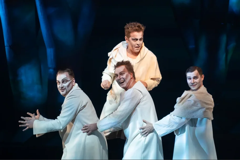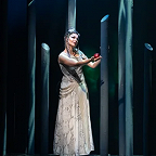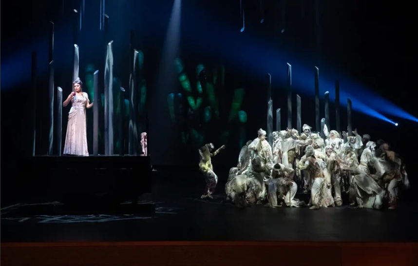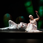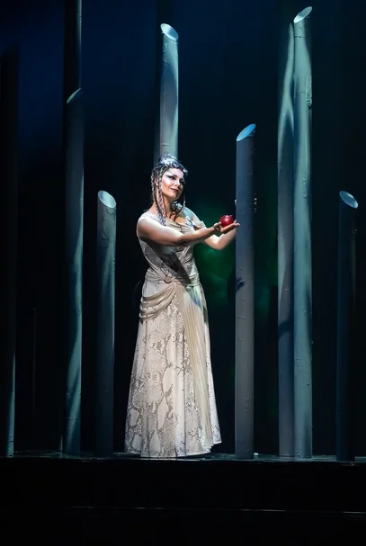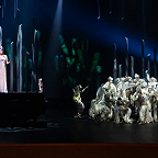 Не войдет символизм, пронизывающий оперу от и до, в спектакль Дмитрия Бертмана. А редким его вкраплениям в стиль, настраивающий на нужную волну, не превратиться. Поэтому ускользал, как песок сквозь пальцы, аллегоризм странных «кактусов», не страшили всё удлиняющиеся волосы героини (как страшили они бедного Альфу), да и поэзия, родная сестра символизма, пышно расцветшая в оперном опусе, обнаруживалась все больше в титрах.