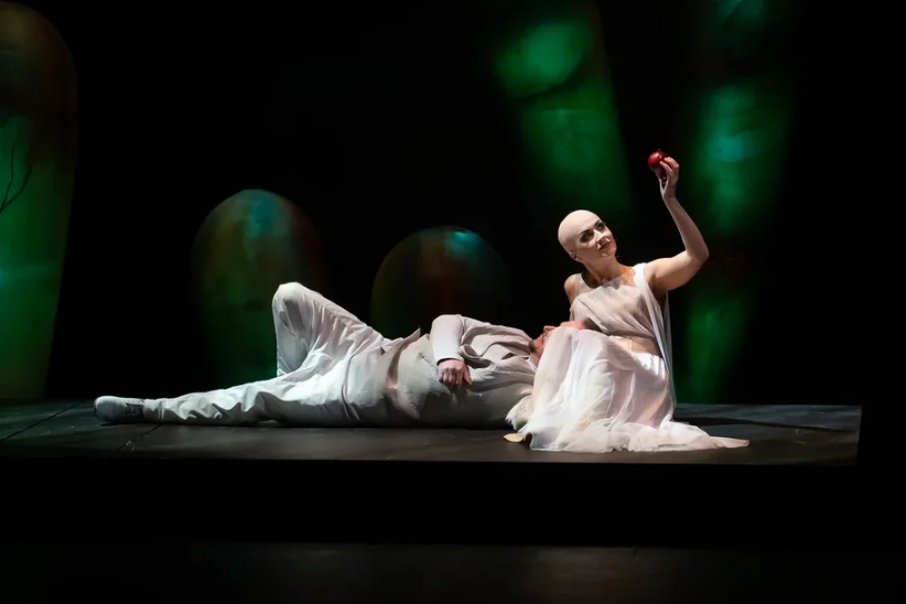 На некоем острове Альфа (Он) и Омега (Она) говорят-не наговорятся о своей любви. Их сердца чисты, души невинны, как у Адама и Евы в раю. За ними наблюдает Змей и обитатели острова, видом то ли бандерлоги, то ли сурикаты. Первый уже плотоядно облизывается – кого он только не соблазнил в этих краях, порушив крепкие звериные семьи (а почему, как вы думаете, рога у оленя, странный вырост у носорога и подозрительный хобот у слона, раньше имевшего вполне презентабельную физиономию?). Но обитатели острова, умиляясь человеческой любви, уверены: Змею здесь не поживиться, Омега устоит. Не устоит. И, поддавшись искушению, потом бросится во все тяжкие, отдаваясь всем, кто пожелает. Наплодит несчетное количество полулюдей-полузверушек. Все, что останется в ней человеческого, – это материнская любовь к этим уродцам. Но душа ее осквернена, и она призывает их: не выпрямляйтесь подобно человекам, ходите на четвереньках, так удобнее, так даже красивее. Кружащий все время где-то рядом Альфа в отчаянии все-таки убьет ее. А уродцы – его. И вот апофеоз: островок, кишащий зачуханными, кривляющимися, дерущимися за место под солнцем детишками Евы-Омеги. А рядом что-то вроде престола, на котором воцарился Змей, протягивающий свое очередное яблочко, – на сей раз публике (спасибо, эти яблочки на нашем столе и без того не переводятся). Так за час сорок Гиль Шохат и его соавторы-либреттисты Дори Манор и Анна Германн рассказали историю человечества до наших дней, ухитрившись, вольно интерпретировав сюжетные линии Библии, дух великой Книги сохранить.