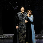 Этот спектакль можно определить одним словом: стильность. Она и в гармоничном сочетании цветов (черного, темно-красного, белого и золотого), и в тонкости световой партитуры (работа Винченцо Рапони), и в почти философском сопоставлении метафоры и бытовой конкретики, общего и деталей. В оригинале в Петербурге мощные каменные кладки крепостей, неземное свечение металлических деревьев, огненные всполохи костров – все играет на создание атмосферы душераздирающей романтической трагедии. В сценическом действии много условного и не настаивающего на конкретике, тем не менее спектакль воспринимается как исторический и традиционный, рассказывающий о кроваво-жестоких средневековых распрях, любовных страстях и борьбе с деспотизмом. В московской версии постановка многого недосчиталась, и видеографика на экране задника была призвана заменить важные элементы сценографии. Акцент переместился на костюмы (через платье, приближенное к историческому, транслировался «дух эпохи») и актерское мастерство певцов, выступающих на почти голой сцене.