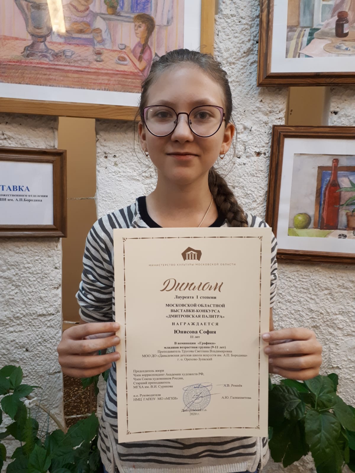 Успехи юных художников заметны далеко за пределами родной школы – ежегодно в среднем четыре выпускника поступают в профильные учебные заведения Москвы и Московской области. Так, студенткой факультета дизайна колледжа Гжельского университета стала настоящая «звездочка» и гордость школы Анна Бурчикова, лауреат множества конкурсов различного уровня, обладатель обширного портфолио. В прошлом учебном году Анна, находясь в выпускном классе художественного отделения Давыдовской школы искусств, прошла строгий экспертный отбор для участия в интенсивном курсе по авторской образовательной программе Сергея Андрияки «Основы многослойной акварельной живописи»: со всей Московской области были приняты только 33 предоставившие портфолио с работами по живописи и рисунку кандидата. Аня с большим удовольствием и интересом проходила обучение и с успехом его завершила: по результатам окончания курса в ДШИ была организована выставка работ Анны Бурчиковой.