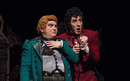 В полном согласии с буффонным актерствованием находится и музыкальное решение. Гибкий и выразительный речитатив, четкость дикции, интонационное разнообразие – всем этим блестяще владеют исполнители, создающие замечательный ансамбль персонажей: томный и робкий Подколёсин Максима Дорофеева, нагловато-авантюрный Кочкарёв Андрея Панкратова, суматошная Фёкла Анастасии Ялдиной, глуповато-наивная Агафья Анны Малькиной, приземленно-рассудительная Арина Пантелеймоновна Натальи Елисеевой, а также уморительные женихи, созданные Владиславом Дорожкиным (Яичница), Олегом Банковским (Анучкин), Максимом Усачёвым (Жевакин), и слуги, гротескно воплощенные Георгием Сологубом (Степан) и Юлией Волковой (Дуняша).