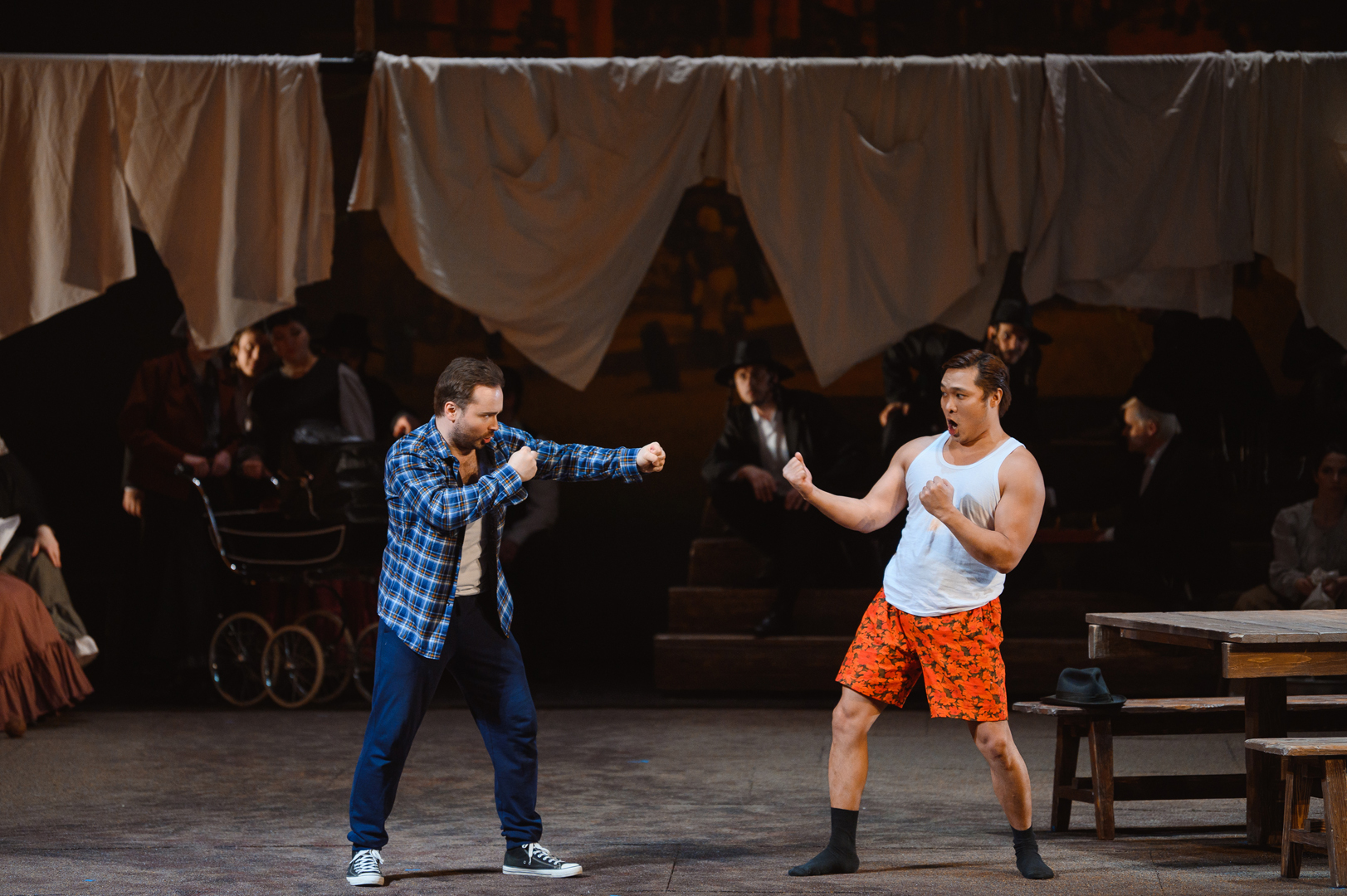 Постановка, вступившая в контрапунктическую связь с «Кармен», – «Богатыри» Красноярского театра оперы и балета. Обе работы – фарс, только одна таковым является по природе, а другая в фарсовые одежки наряжена специально, напоказ. Обе коллажны по музыке. В обеих энергетика лихой подворотни и политическая заряженность. Но «Богатырей» в Москву не привезли. Что случилось? Судя по видео, полученному из театра, спектакль 2020 года рождения – фантастически точное попадание в наше сегодня. Где уже и без оперных шутих грохоту предостаточно.