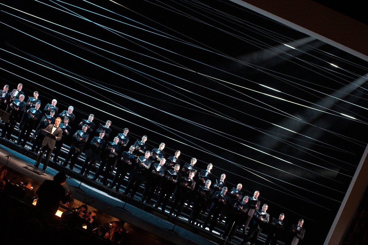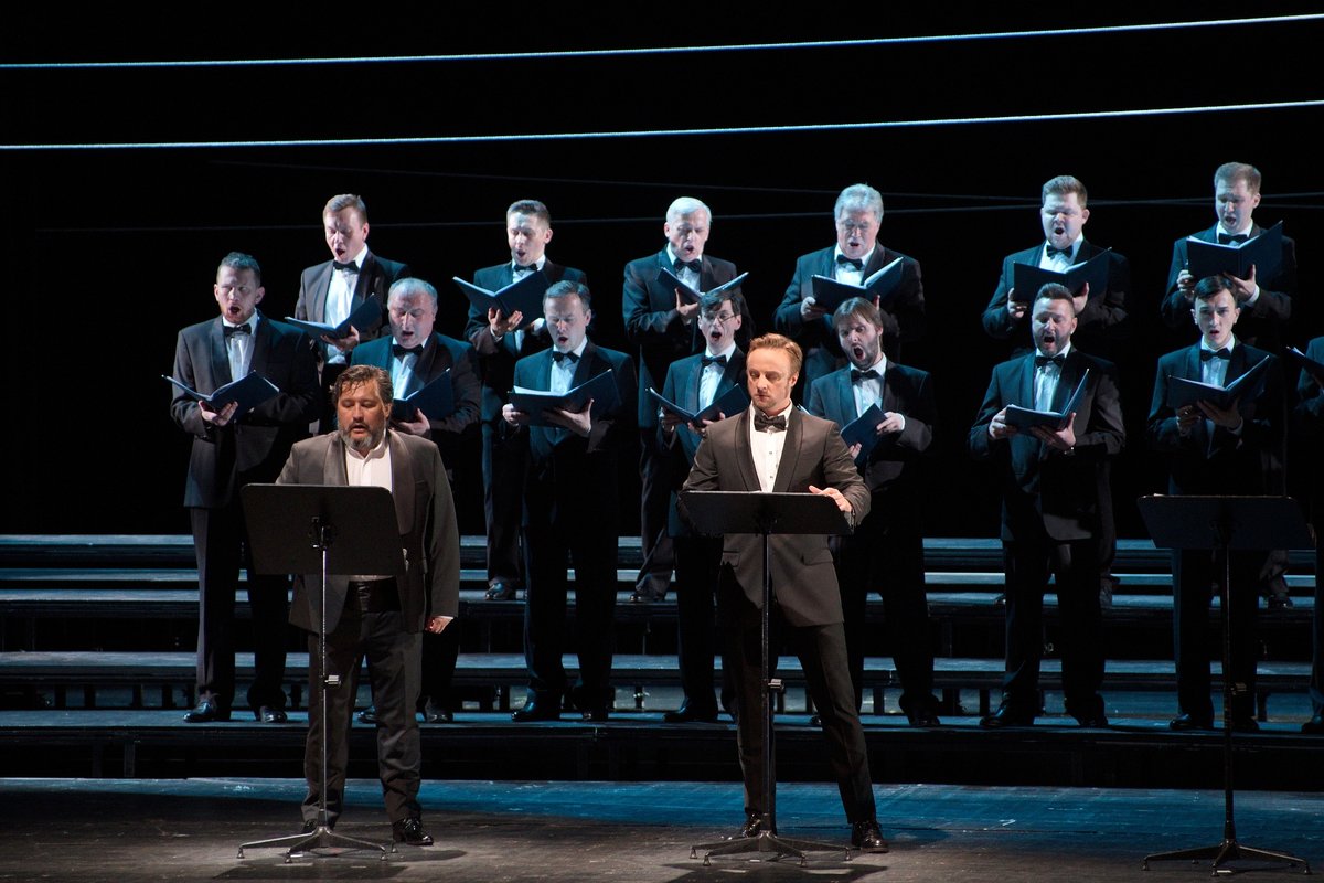«Фальстафа» привез Мариинский театр в рамках Московского Пасхального фестиваля. Вопреки заявленному концертному исполнению в Зале Чайковского публика увидела полноценный спектакль – версию итальянского режиссера Андреа де Роза, которая идет на Новой сцене Мариинки с 2018 года, но в адаптации к условиям проката в чужом пространстве от Екатерины Малой. Были полностью сохранены костюмы и частично – световая партитура; присутствовало немало элементов реквизита, хотя сценография, конечно, недосчиталась многого: основным ее элементом стали три гигантские полупрозрачные ширмы-панели, которые, меняя расположение, преобразовывали не слишком подходящую для спектакля сцену в нечто более дружелюбное.