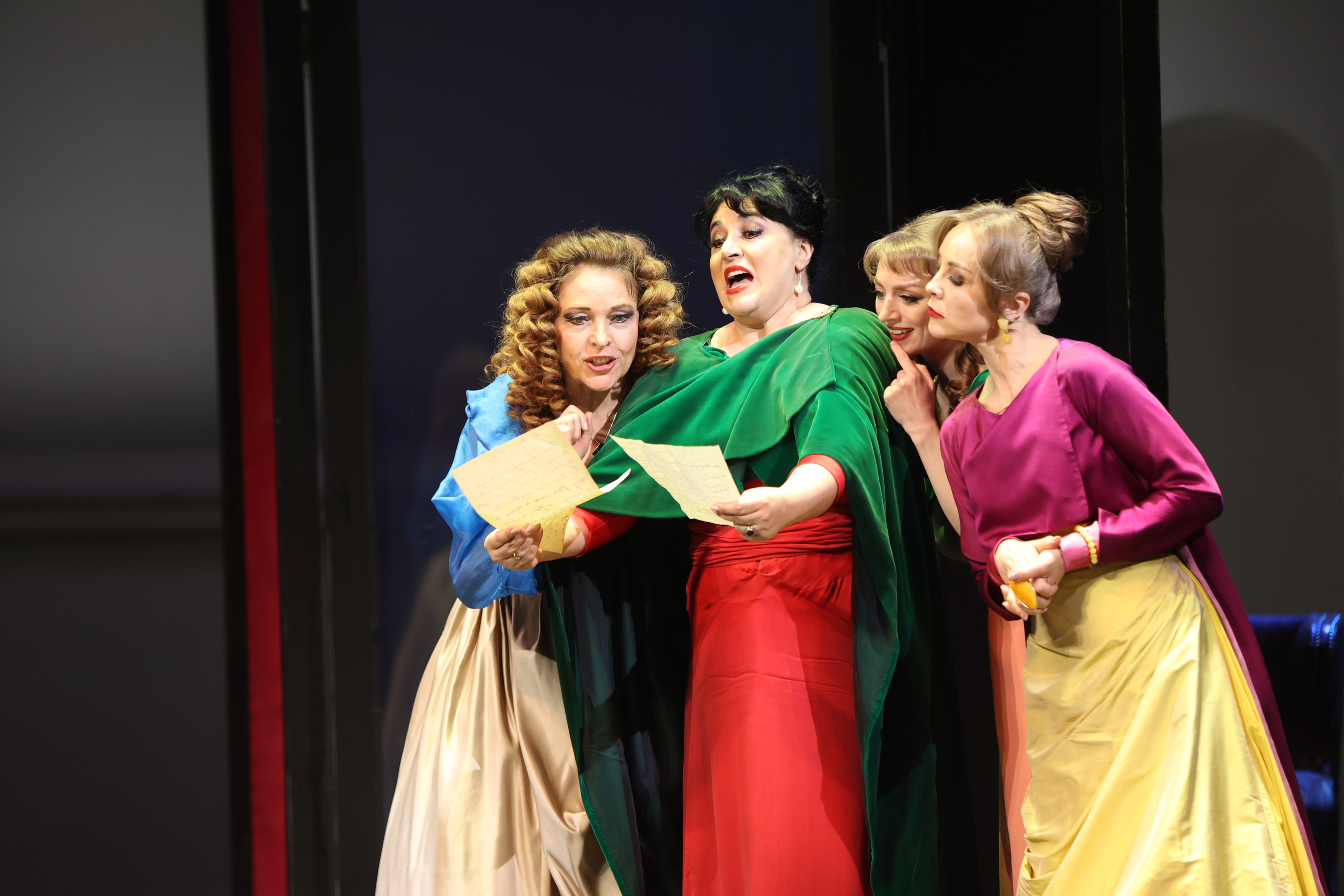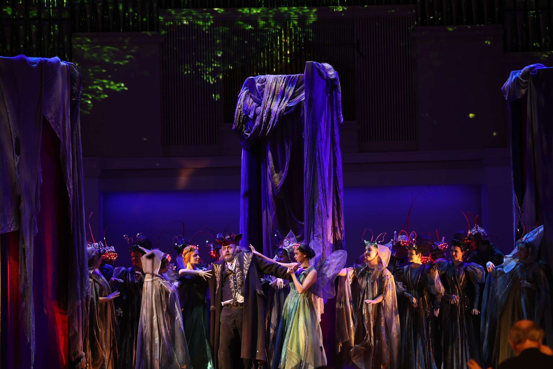 Мариинские солисты принимают эти правила игры: вокализируют легко, воздушно. Даже массивный и богатейший, красивейший голос Татьяны Сержан (Алиса) порхает словно бабочка, удивляя феерическим мастерством. Естественная гибкость обнаруживается и у сочного меццо Екатерины Сергеевой (Мэг), а Анна Кикнадзе (Квикли) к приятному вокалу и утрированно контральтовым низам добавляет необыкновенную игровую живость – ее героиня блещет плутовством, если не хулиганством. Хороша лирическая пара: нежные, но яркие голоса молодых солистов Анны Денисовой (Нанетта) и Александра Михайлова (Фентон) гармонично сливаются в чарующие дуэттино. Михайлову частенько поручают более тяжелые партии, в которых он явно теряется, а вот ультра-лирический герой для его нежного компактного тенора – в самую пору.