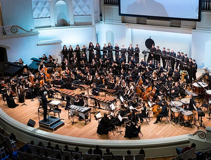 В понимании Стива Райха симфонический оркестр очень специфичен: вибрафоны, маримбы и ксилофоны располагаются в центре, справа – другие многочисленные ударные, слева – два рояля и три синтезатора; остальное сценическое пространство заполнено хористами и расширенным составом струнных и духовых (ведущий концерта Ярослав Тимофеев сразу предупредил, что «пустыня» будет густонаселенной). Российский национальный молодежный симфонический оркестр и вокальный ансамбль Intrada Екатерины Антоненко под управлением питерского дирижера Федора Леднёва были великолепны. Особенно удивительна выносливость вокалистов, которые были задействованы без перерывов на протяжении академического часа. Кстати, композитор предполагал возможность замены сопрано, но это, кажется, не понадобилось. А как безупречно выстраивались в хоре не самые простые созвучия! Не менее удивительно и то, что российская премьера произведения состоялась только сейчас (вероятно, к 85-летию его автора).