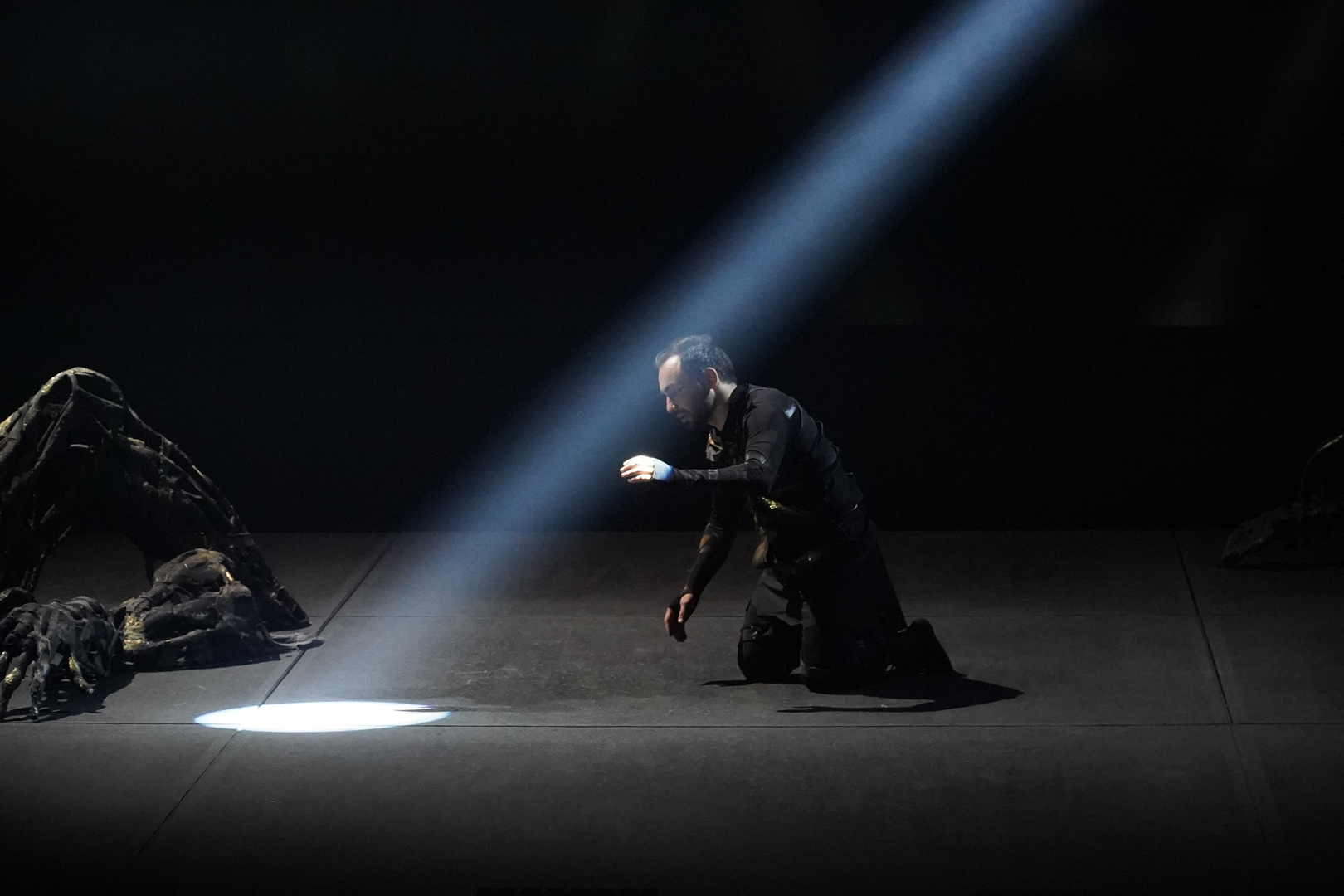 А там – исполинские, необыкновенной красоты скульптуры, устремляющиеся под колосники. Именитый эстонский художник Тауно Кангро, придумавший этих полуобнаженных музыкантов с экзотическими инструментами, намекнул на тягу древних египтян к вселенским масштабам, но при этом напрочь лишил фигуры типичной статуарности: они сама экспрессия, ток, красота не мертвого, но живого. Четыре из них – девы с тонким станом, две – гермафродиты с мужским разворотом плеч и женской грудью. Эти последние – на первом плане, они притягивают внимание и явно хотят нам о чем-то сказать. Вряд ли о лежащем на поверхности – двойственности человеческой природы, что кому-то по нынешним временам норма, а кому-то отклонение от нее (Бог создал мужчину и женщину. Точка). Нет, гермафродические образы намекнут на существо спектакля, в котором герои предстанут сгустками психологических противоречий с уклоном в ненормальность: отношений, чувств, личностных свойств.