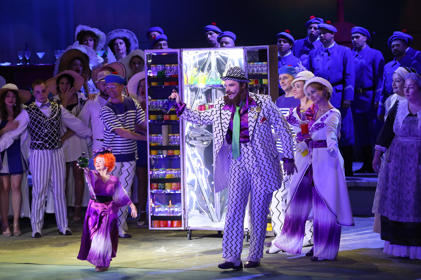 В целом же спектаклю недоставало белькантовой стильности. Похоже, маэстро Олег Лесун посчитал, что для комической оперы это не главное: если весело, бодро, задорно, драйвово, то и достаточно, а за утонченными изысками желающие пусть отправляются на образцы драматического бельканто. Такой подход разделяют многие: именно поэтому часто играемые популярные оперы комического бельканто (наряду с «Напитком», например, еще более хитовый «Севильский цирюльник») нередко звучат прямолинейно и без нужного лоска. Релаксационные усилия постановщиков в большей степени в этом случае сосредоточены на визуальных впечатлениях публики, на стремлении к куражу драматической игры, что значительно обедняет кумулятивный эффект, какого можно было бы достичь, не умаляя внимания к музыкальным достоинствам таких произведений.