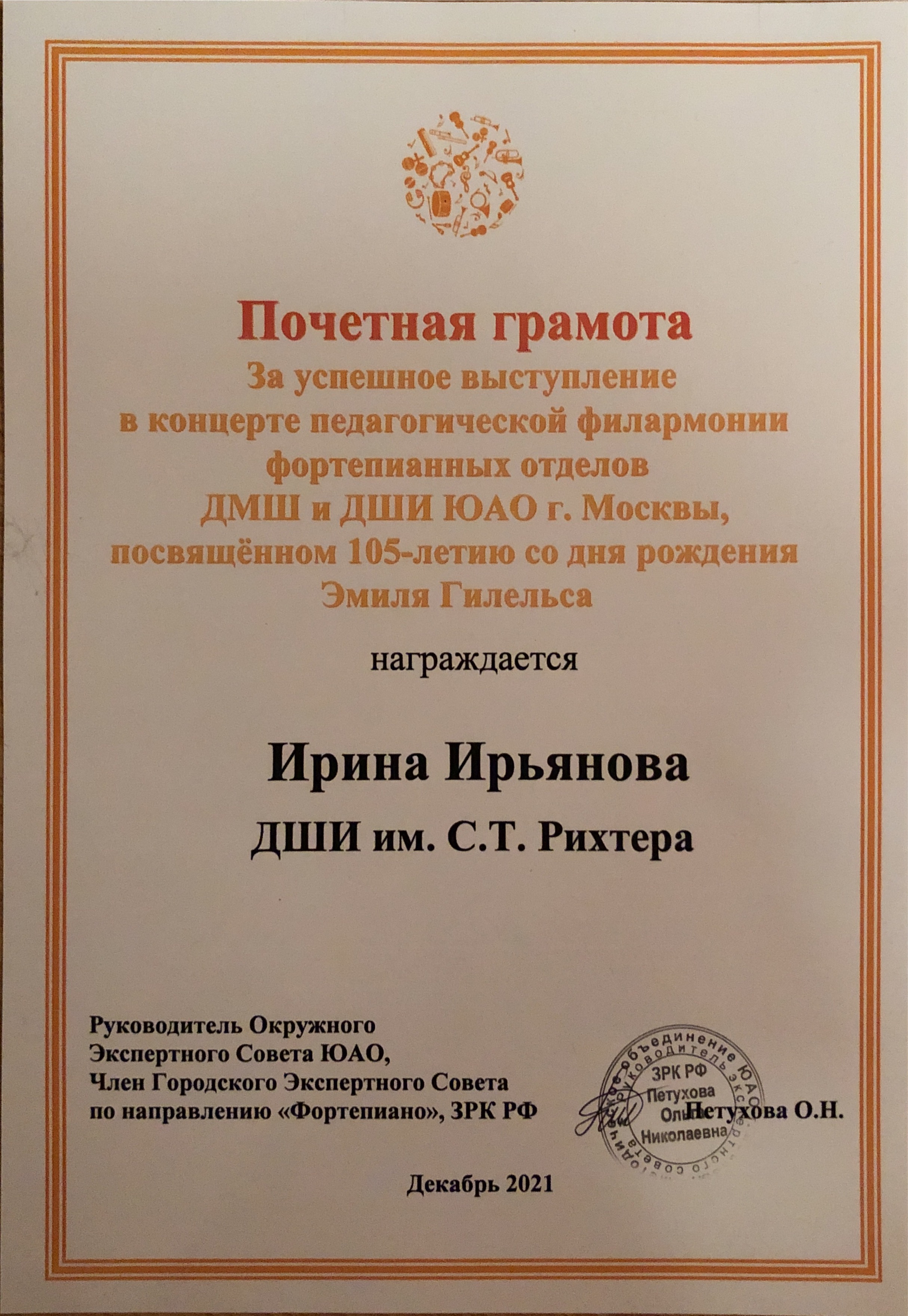 Пианистка Ирьянова востребована как исполнитель – более сотни концертов она дала на концертных площадках Москвы как приглашенный артист, с успехом гастролировала по городам России (Санкт-Петербург, Архангельск, Ростов-на-Дону, Клин и др.), за рубежом (Австрия, Польша, Венгрия, Мальта). Ирина Ирьянова – постоянный участник, конкурсов и фестивалей, среди которых фестиваль Musica Iberica «испанская весна», выступления в рамках фонда «Новые имена», в проекте «Вместе с мамой», «Ночь музеев» и др. Успехи Ирины Ирьяновой замечены на высоком административном уровне: среди множества благодарственных писем и почетных грамот выделяется «Благодарность за большой вклад в развитие культуры г. Москвы, успехи в области эстетического воспитания подрастающего поколения» от Министра Правительства Москвы, руководителя Департамента культуры Москвы Александра Владимировича Кибовского.