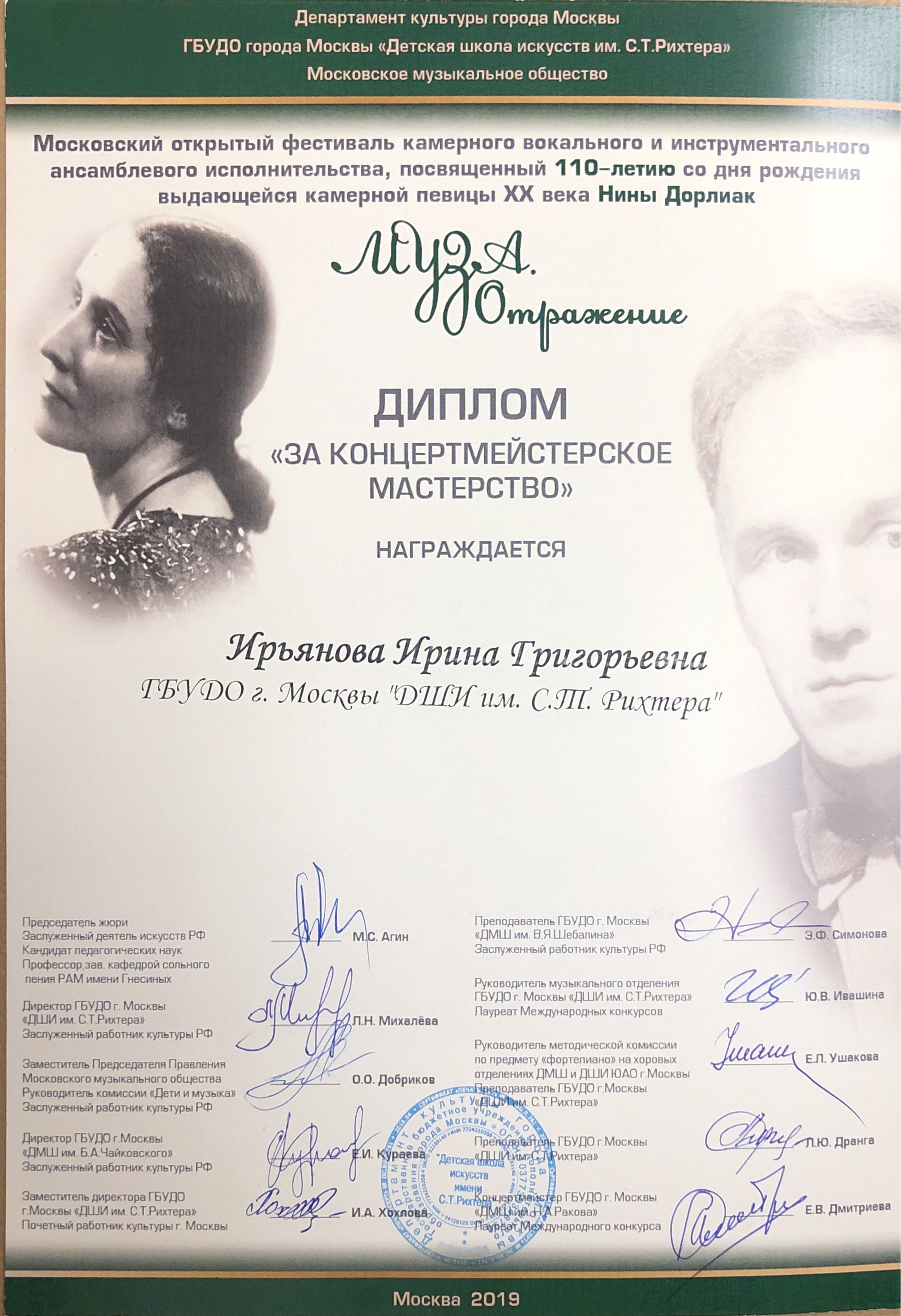 Ирина Ирьянова совмещает педагогическую и концертную деятельность. В послужном списке: работа в РАМ им. Гнесиных, в институте им. Шнитке, во многих музыкальных школах столицы. На сегодняшний день Ирина Григорьевна Ирьянова - преподаватель фортепиано и заведующая концертмейстерским отделом и Московской ДШИ им. С.Т. Рихтера. Отличилась на XVIII Молодежных Дельфийских играх, где в 2019 году выступала как концертмейстер с домристкой Елизаветой Ракушиной. Результат – золото в престижном состязании молодых деятелей искусств. Событие широко обсуждалось в прессе и было отмечено лично мэром г. Москвы С. Собяниным.