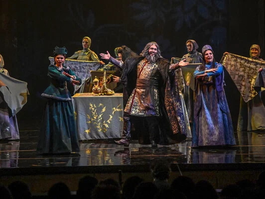 В истории Новосибирского оперного это уже пятое обращение к знаменитому опусу. Впервые он был поставлен здесь еще в 1949-м, в первую пятилетку существования «Большого театра Сибири» (еще одно неофициальное название коллектива). Потом долго жила постановка 1975 года, сделанная режиссером В. Багратуни и легендарным новосибирским маэстро Исидором Заком. В 1995-м опера вернулась в репертуар в концертном варианте, а в 2000-м появился спектакль М. Сулимовой: его тоже давали нередко, но любимым у публики он не стал. Затем последовал длительный перерыв, когда «Царская» отсутствовала в репертуаре вовсе, хотя сказать, что Римский-Корсаков в Новосибирске обижен, нельзя: в сегодняшней афише театра есть «Снегурочка», «Кащей бессмертный» и «Моцарт и Сальери».