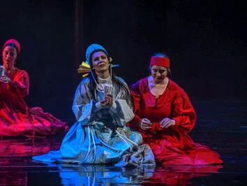 Цветовая гамма имеет колоссальное значение в спектакле (костюмы Петра Окунева). Для чистой Марфы – цвет белый, для наивного и мечтательного Лыкова – голубой, для коварного Бомелия – зеленоватый, для несчастной Любаши – глубокий темно-синий. Косматые длинноволосые опричники – в черном, танцующая безликая слободская массовка – в сером (она усилена участием ансамбля песни и танца "Чалдоны", худрук Евгений Малышев, балетмейстер Елена Букшина). Очень важен лейтмотив красного цвета: он и символ праздника, любви, но он же – маркер крови и жестокости, коварства и интриг. Неслучайно краснотой отливает костюм Малюты Скуратова – кровожадного предводителя опричников, а красным веером жонглирует Бомелий. И красный же сыграет ключевую роль в последнем акте.