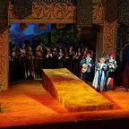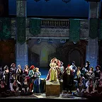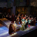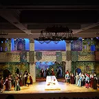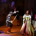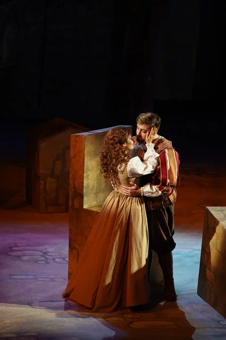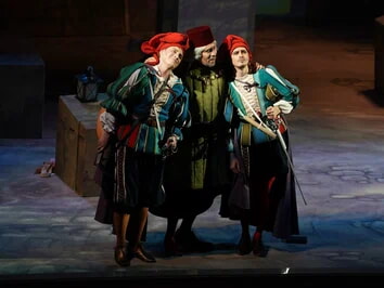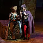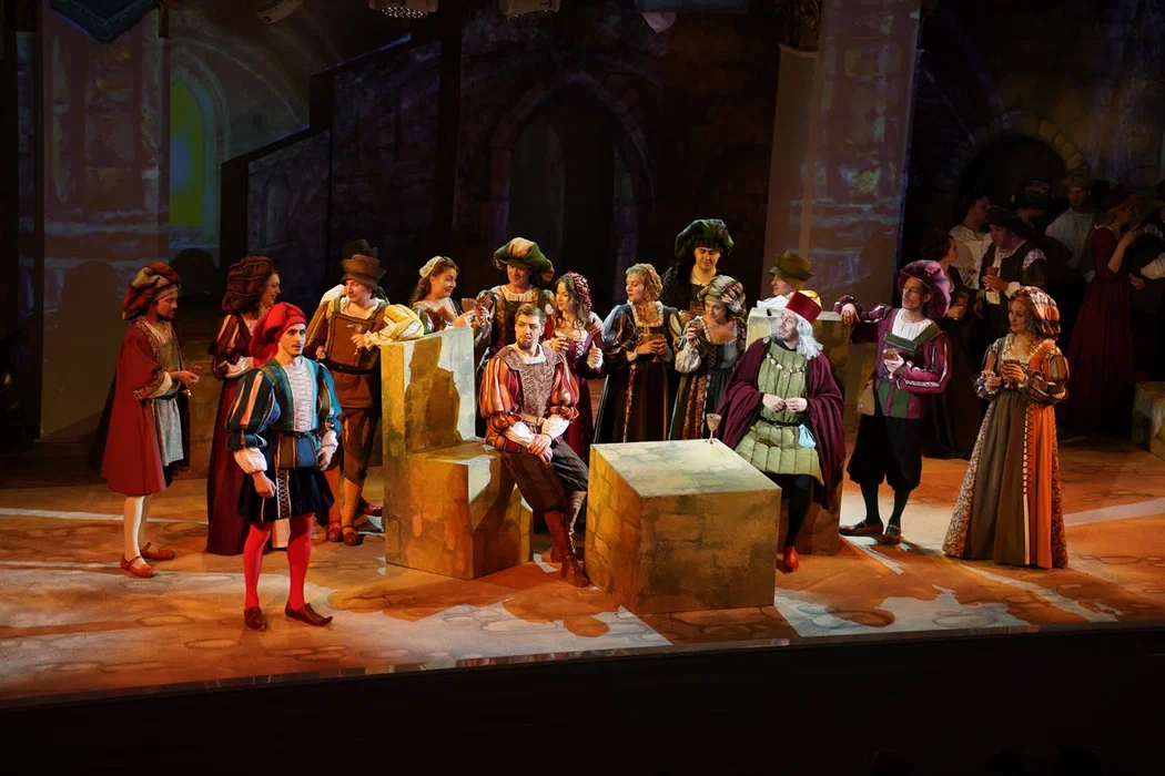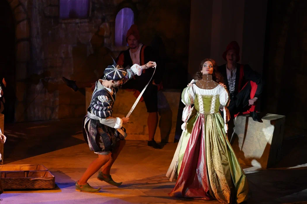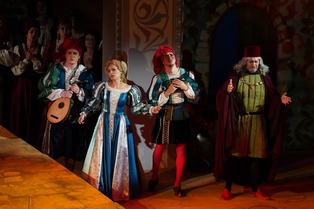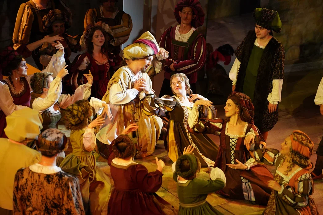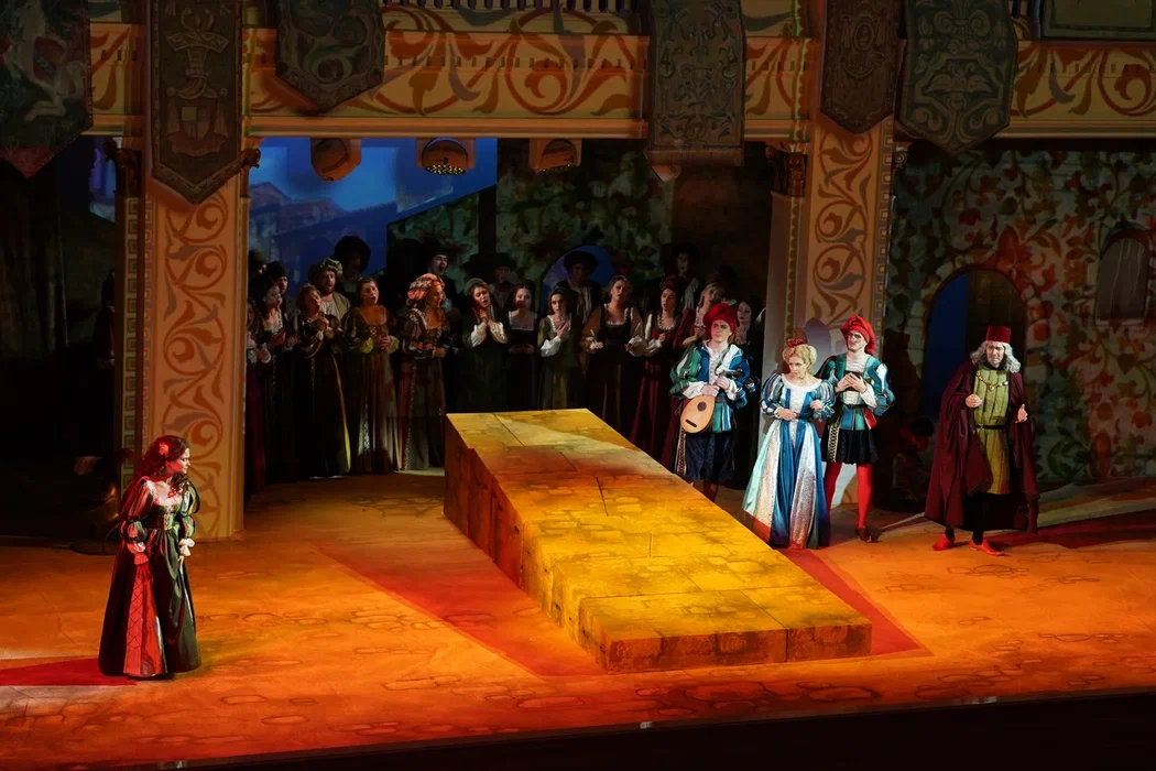 Но театр не только плюсы, а и минусы обращает себе во благо. В отношении первого – создание реалистической постановки, где основное внимание сосредоточено на актерском раскрытии вокально-драматических образов. Молодая режиссер Ирина Гаудасинская, недавний лауреат конкурса «Нано-опера», не ставит задачу поразить необычной концепцией или парадоксальными решениями, ее цель – выявить весь потенциал произведения и дать шанс публике полюбить его. С этим Гаудасинская справляется блестяще. На сцене весело, живо, динамично, но при этом – в антураже Падуи шекспировских времен, без набивших оскомину телепортаций во времени, без искажения поведенческих мотивов героев. Видна подробная работа с исполнителями (многие из них создают по-настоящему запоминающиеся образы), мизансцены изобретательны, в разводке массовки задействовано все пространство зала – спектакль содержит элементы иммерсивности, зрителя активно погружают в атмосферу действия.