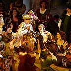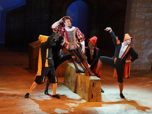 Вместе со сценографом Тимуром Гуляевым режиссер «одевает» белые колонны зала в зеленовато-охристую кладку древних стен с проемами и оконцами: ощущение полное, что вы – на улице или площади средневекового итальянского городка. Полдюжины трапециевидных объемов такого же тона помогают играть сценическим пространством, складываясь то в свадебный стол, то в импровизированную беседку, то в нехитрую меблировку жилища Петруччио. Задействован и балкон над сценой – он очень кстати для всяких романтических мизансцен. Огромное значение в условиях близости к публике приобретают костюмы: яркие, красивые, отсылающие к эпохе Возрождения – «говорящие». Вот, например, два претендента на руку Бианки: словно петухи с воинственными гребешками, они – в красных ренессансных беретах. Сама обворожительная скромница – в бело-голубом, в кружеве и с золотыми нитями – легкая пародия на смиренницу Дездемону. Или зеленое платье Катарины, повседневное, в котором она выходит и к свадебному столу, не желая облачаться в торжественное: в его тоне уже заключен дерзкий, слегка ядовитый характер строптивицы, но в нем же – и намек на витальность и подлинность натуры.