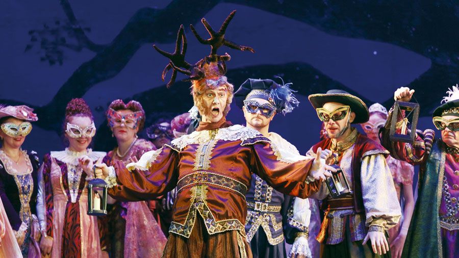 Спектакль петербургского режиссера Александра Лебедева появился в репертуаре донецкого театра два года назад. Еще до вердиевских звуков публику встречают шумы мегаполиса и на аванзанавесе – узнаваемые достопримечательности британской столицы (сценография Сергея Спевякина). Действие перенесено, судя по костюмам (работа Оксаны Кубекиной), в современность, хотя и с вкраплениями старины: отправляясь на завоевание виндзорских кумушек, титульный герой наряжается в кружева и перья шекспировских времен. В последней же картине – в парке, где проказницы устроили западню незадачливому ловеласу, – наблюдается и вовсе богатое смешение всевозможных стилей и эпох. Легкие планшеты способствуют быстрой смене декораций – для каждой картины она своя, поэтому публика видит и городскую площадь, и убранство дома Фордов, и упомянутый парк с огромным дубом, и театральный подвал. Последний тут появился не по ошибке: он заменяет собой положенный по либретто Арриго Бойто трактир, поскольку в версии Лебедева Фальстаф – старый, самовлюбленный, но уже невостребованный артист: о былой славе напоминают лишь развешанные по стенам старые афиши. Прием «театр в театре» не революционен, но для гротескного образа Фальстафа и комедийно-маскарадного содержания шедевра Верди оказывается хорошей находкой.