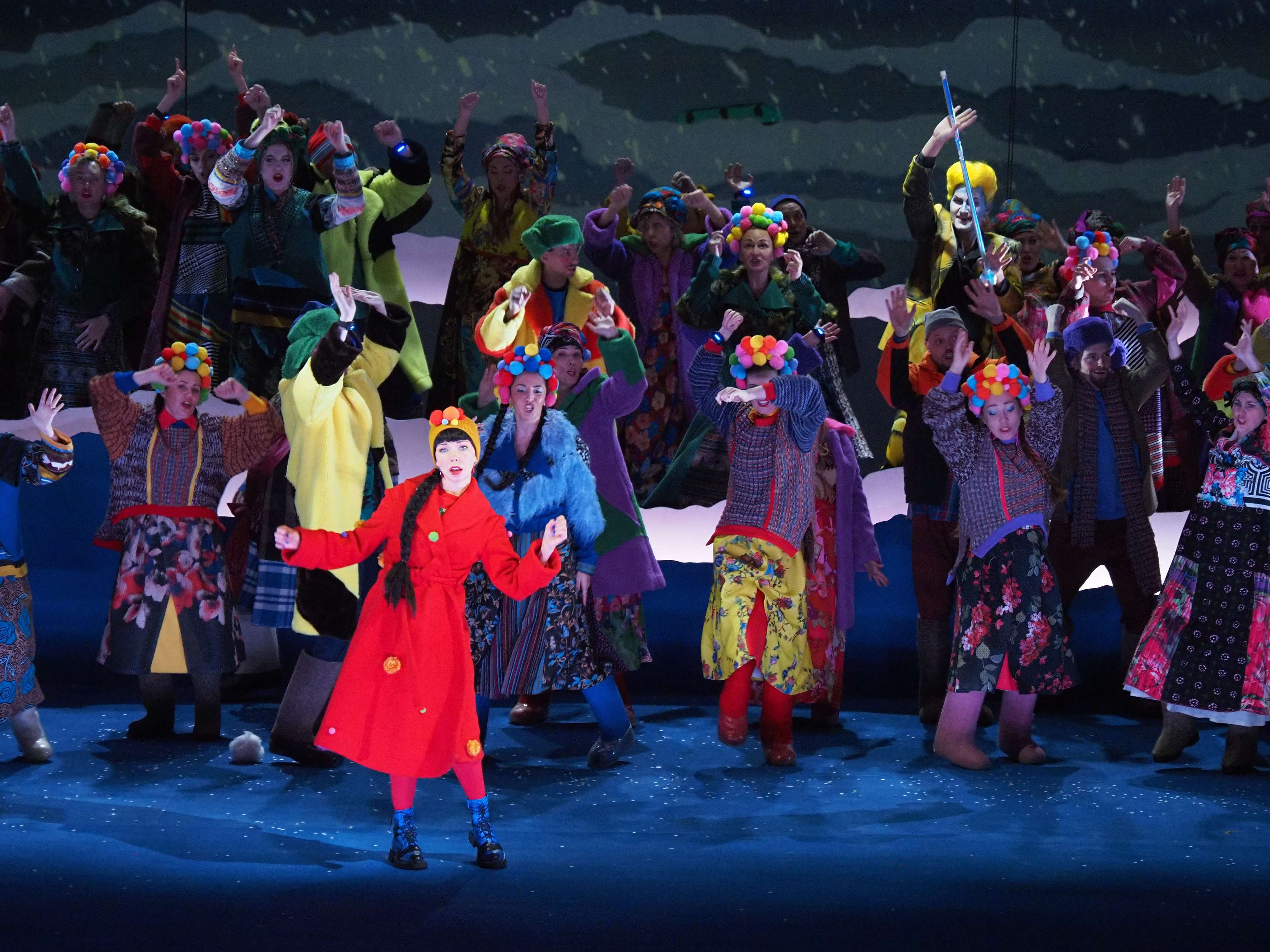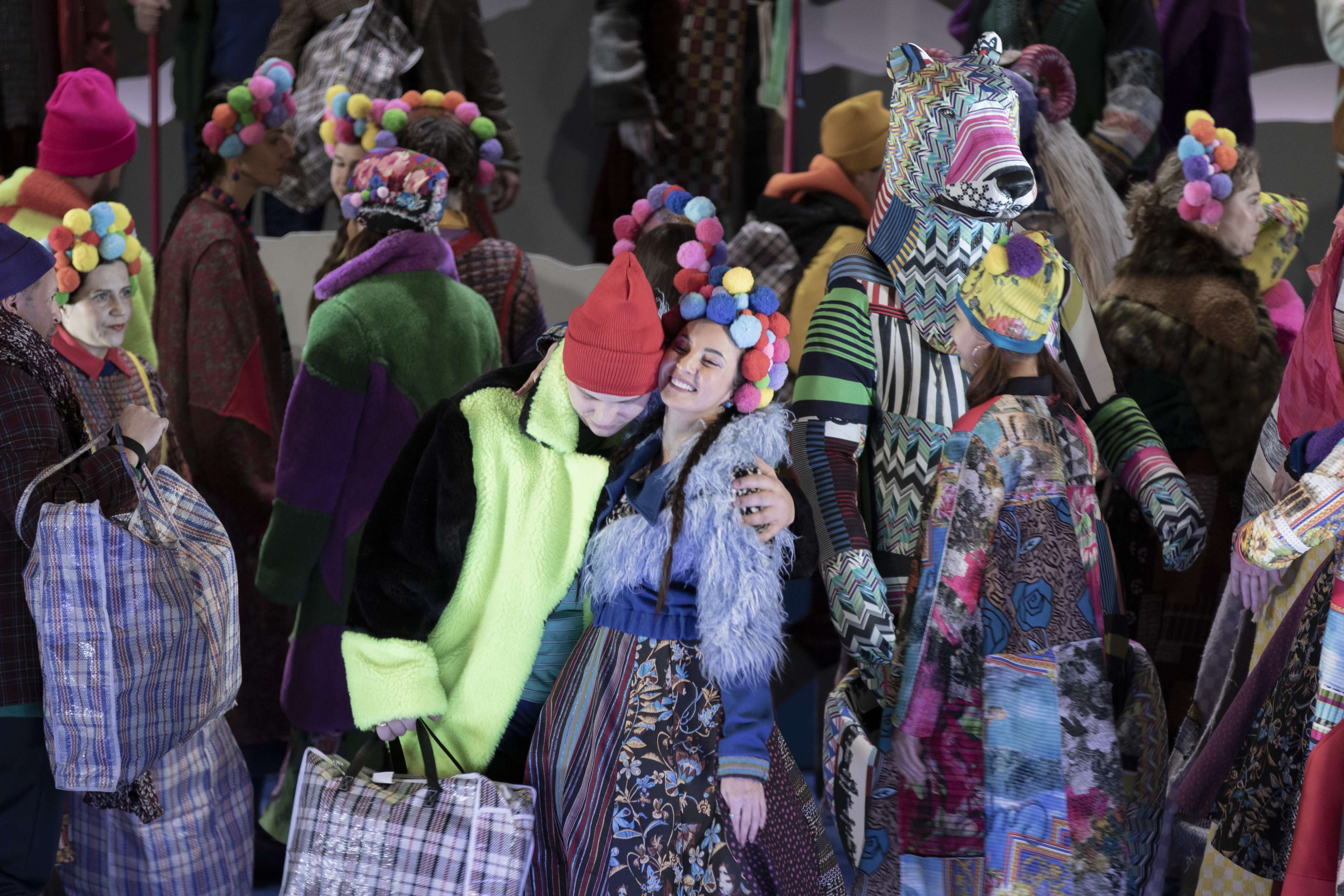 На сцене невероятно пестро и ярко. Кричащие и на первый взгляд мало сочетающиеся цветовые решения ошарашивают с первой же картины у Солохи. Та выходит к публике в бигуди, халате в розовых цветах, огромных валенках и с двумя черными полиэтиленовыми мешками – видимо, хозяйка прибрала не только себя, но и хату. В пандан к ней Бес – весь в золотом, эдакий симбиоз Элвиса Пресли, Дэвида Боуи и Николая Баскова с начесом-коком и светящимся жезлом-волшебной палочкой: забавная пародия на оперных Мефистофелей всех мастей. Картонные трафареты – сугробы и облака; хатки – щитовые домики то тут, то там; на заднем плане в перспективе – три вышки ЛЭП. Безошибочно узнается родимое «чудное приволье» – малообжитое, малообустроенное, в котором нет комфорта, а жизнь кипит на все сто.