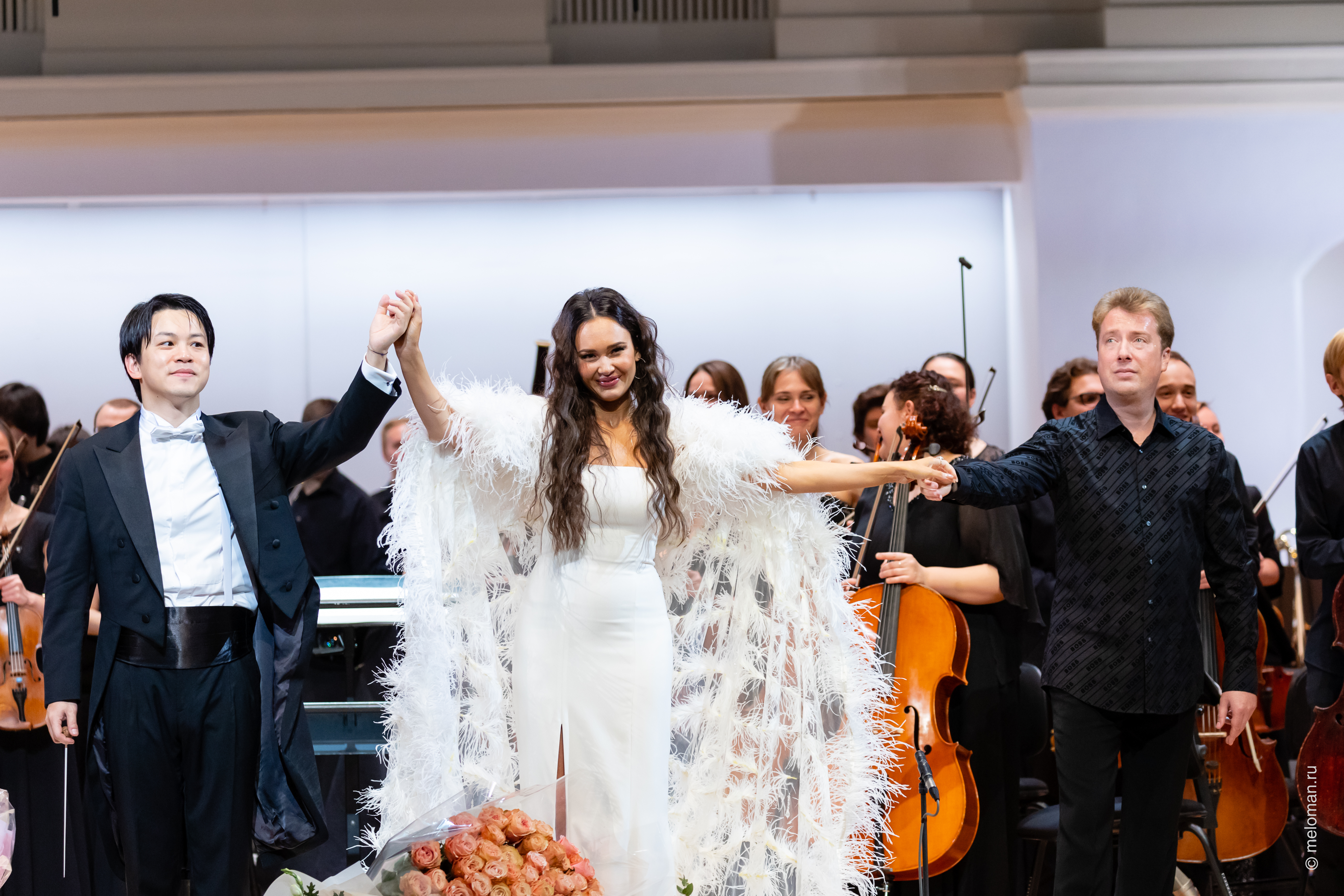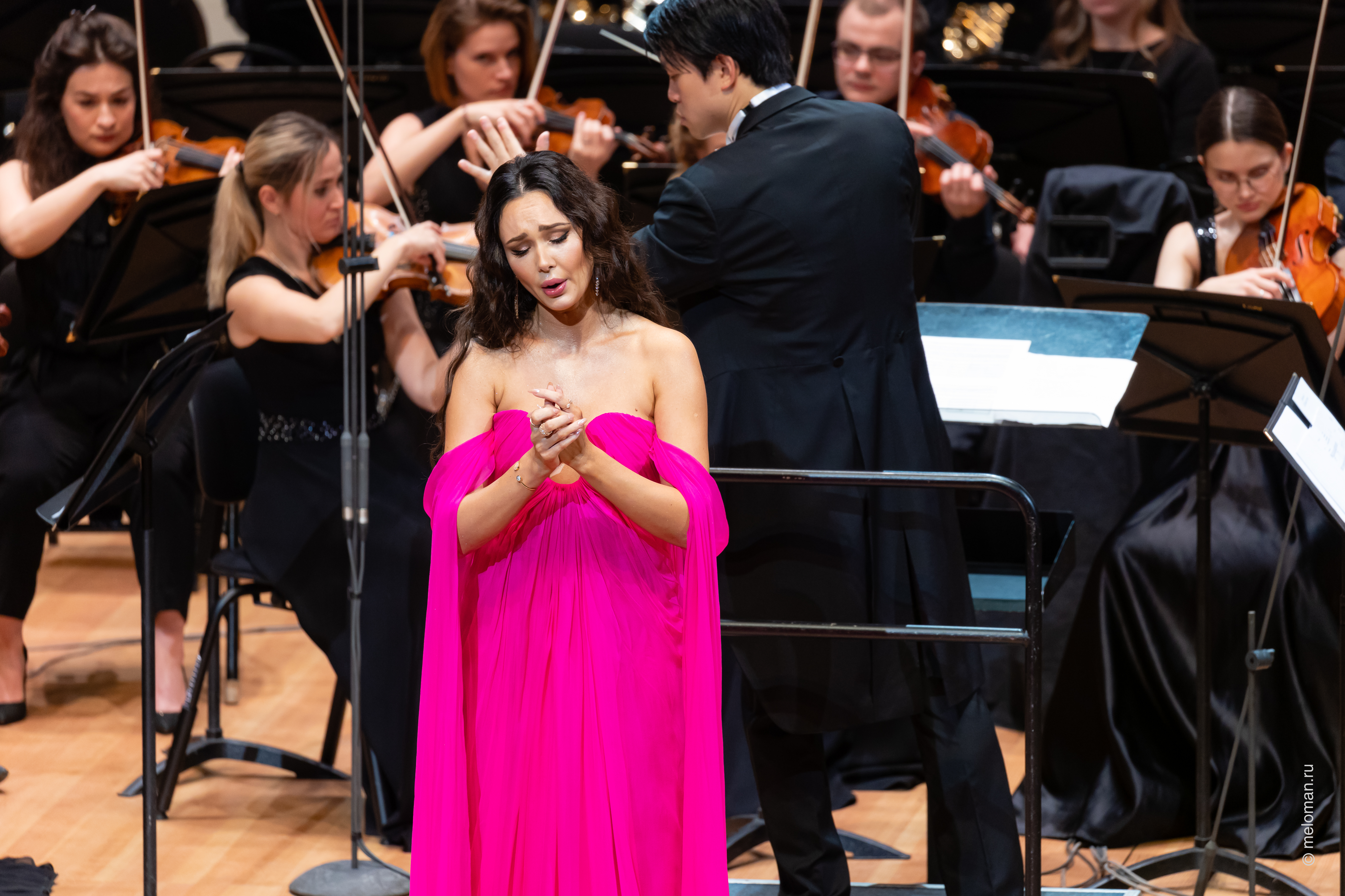 В частности, заявлялись Вступление к «Пиковой даме», увертюры к «Силе судьбы» и «Травиате», интермеццо из «Сельской чести» и «Манон Леско», за которые отвечал Российский национальный молодежный оркестр под управлением Хаожаня Ли (этим летом взявшего III премию на Конкурсе Рахманинова). Пинхасович, помимо Арии Елецкого, спел Каватину Валентина из «Фауста». Да и сама хозяйка вечера, вбросившая в публику пригоршню легкомысленных номеров – упомянутых и новых, вроде «Красавиц Кадикса», арии из сарсуэлы и вальса Мюзетты, – захотела предъявить кое-что посерьезнее. Встречайте: Виолетта и Русалка (обе партии – из петых ею на европейских сценах), Тоска и героиня «Мазепы» Мария (как, вероятно, задел на будущее).