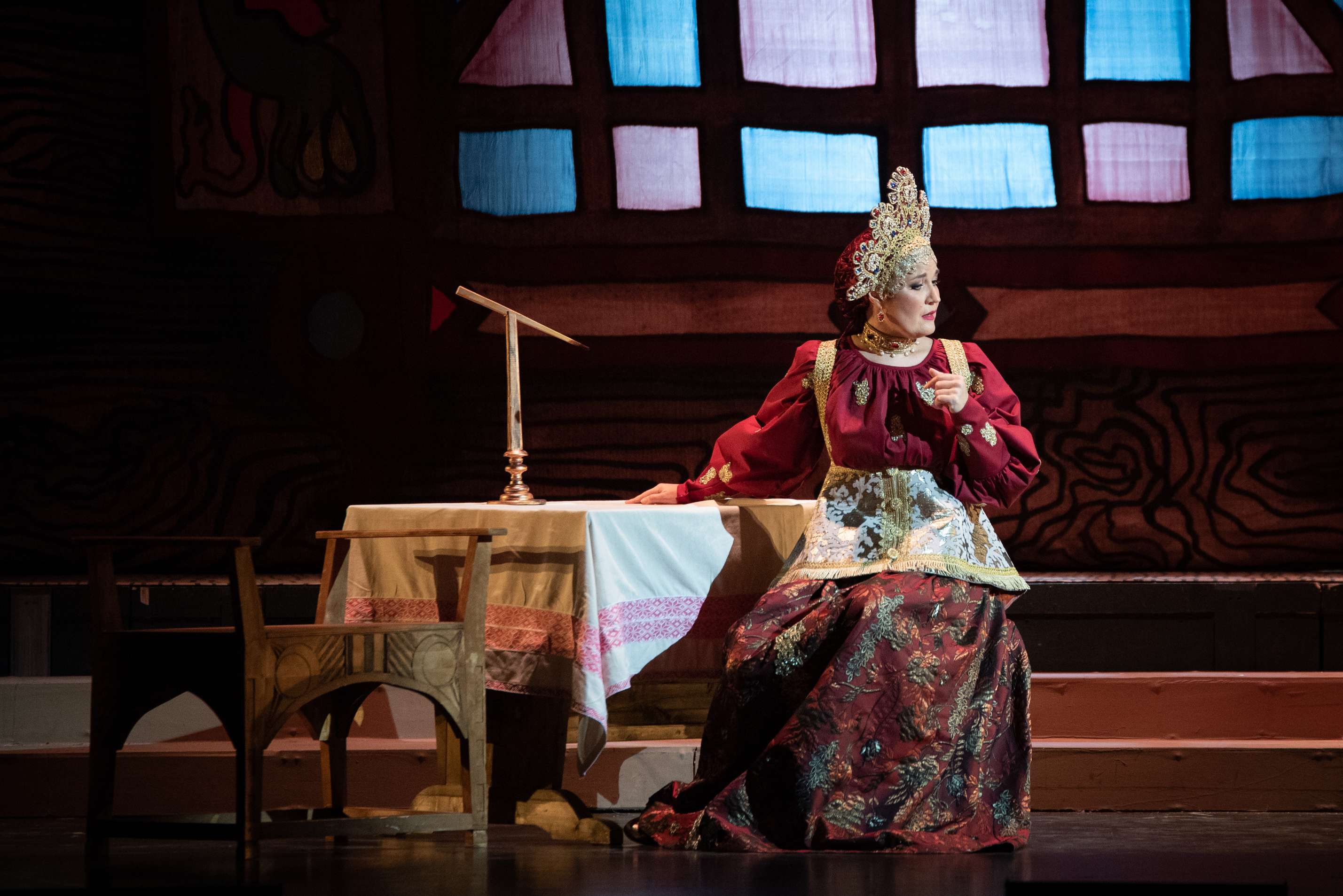 Понятно, что коль скоро режиссуру берет на себя известный певец, едва ли стоит ожидать каких-то радикальных жестов, претензий на «авторское» начало. Аскар Абдразаков и не скрывал, что хочет перенести зрителя в былинно-сказочный мир, опираясь на эстетику старого, современного этой корсаковской опере театра. Подобный подход редко приносит настоящую удачу, однако в Уфе случилось иначе. Прежде всего, потому, что художник-постановщик Иван Складчиков, чья работа в значительной мере и определила успех премьеры, избрал в качестве пути реализации заданной цели не реконструкцию/реставрацию, но свободную фантазию по мотивам декораций и костюмов начала прошлого столетия, включая их в более обширный культурологический контекст. Такого пиршества для глаз мы давно не видели даже и на подмостках обеих столиц.