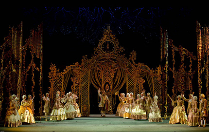 В целом характер спектакля (или самого произведения?) слишком дидактически-детский, словно ставили не оперу, а школьный утренник. Постановка (1999 год) отличается исключительным традиционализмом. Сценография Вячеслава Окунева эксплуатирует бело-золотую гамму в декорациях: на их фоне – яркие кричащие цвета в костюмах у отрицательных персонажей (мачеха – в фиолетовом, дочки – в ядовито-розовом и ядовито-зеленом) и пастельно-светлые – у положительных. На сцене – сказочная Франция и сказочный век барокко-рококо, без претензий на достоверность, а скорее, с надеждой на узнавание привычных штампов: золоченые решетки и барочные завитушки, парики и кринолины, камзолы в галунах и чулки с бантами. Изяществом отличается постановка танцев (Мария Большакова и Евгений Мясищев) и хороший уровень исполняющего их кордебалета.