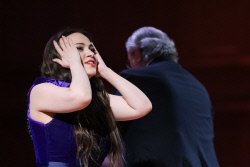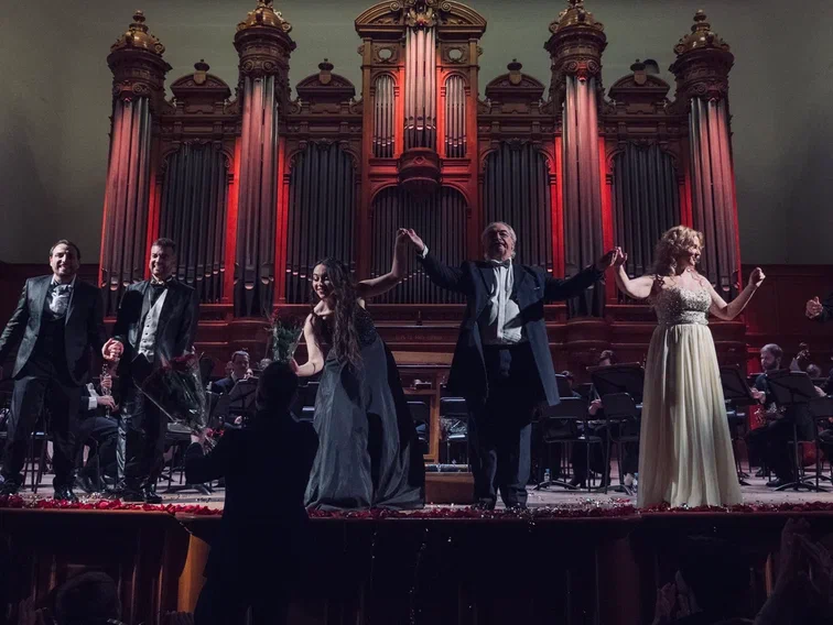Некартинно, легко, почти прозрачно спела «Хабанеру» и «Цыганскую песню» из оперы Бизе (невесть как попавшие в русско-итальянскую программу) молодая солистка Большого Юлия Мазурова. Такой Кармен мало кто видит. В один прекрасный момент вдруг расцвел разваливший два из трех своих сольных номеров Станислав Мостовой (призванный на замену Богдана Волкова). То, как выписал солист «Новой оперы» душевные движения Ленского, найдя для этого сотни отттенков, дорогого стоит. Разве что третий российский участник концерта интересностью высказывания не отличился. Сопрано Вера Кононова, берясь за Мюзетту, Тоску, Норму, делала подарок самой себе — обладательнице некогда незаурядного голоса, и сегодня временами открывающегося в верхнем регистре сногсшибательным небом в алмазах. Но певица давно ушла из большой оперы и нашла себя в продюсерской деятельности. Это она организовала описываемый концерт, она была его ведущей и она, как директор спецпрограмм Государственного Кремлевского оркестра, по всему, придумала запрячь в одну упряжку коня и трепетную лань, то бишь духовиков и оперных певцов.
