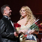 Из него гипотетически следовало, что оперные реки крови и страсти в клочья публике не грозят (потому как на балу принято проводить время с приятностью) и что две национальные ветви великого искусства будут представлены в паритете. По первому пункту ожидания совпали с реальностью не совсем. В хоровод, который водили легкомысленная Мюзетта, медоточивый Неморино и еще ряд изливающих сладостные красоты персонажей, вклинились-таки смятенная Любаша из «Царской» и Ленский, с тоской вопрошающий «Куда, куда вы удалились?». По второму пункту ожидания не оправдались совсем. Итальянского в программе было в избытке, а русского — крохи (помимо двух названных номеров, это Песня певца за сценой Аренского да инструментальный Пушкинский вальс №2 Прокофьева). Причем, наши вокалисты брались и за зарубежный материал, и за родной. Гости же плавали исключительно в своих водах, оставляя без ответа вопрос, а как бы выглядел, к примеру, Чайковский в их прочтении? Каждый предъявил всего по два сольных номера и поучаствовал в коллективном исполнении записных шлягеров - «Застольной» из «Травиаты», «Скажите, девушки», «O Sole mio». Заявленные в программке арии Жермона и Каварадосси не материализовались, но как бы они прозвучали, загадкой не представляется.