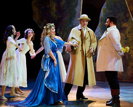 В центре сцены – наклонный ромбический подиум: он похож на театральные подмостки, но в то же время своим положением говорит о неустойчивости первоначальной идиллии. Как в барочном театре, у задника – картонные кущи, имитирующие аркадию, однако сразу понятно, что их благолепие эфемерно (сценограф Этель Иошпа), и вскоре оно действительно исчезнет. В остальном сцена пуста и мрачна, тотальная чернота сулит недоброе. На этом фоне белоснежное подвенечное платье Анны сразу кажется погребальным саваном. Колоссальна роль света (от Стаса Свистуновича): именно ярчайшие, периодически мучающие публику прожекторы создают финальную картину торжества инфернальных сил. Балетное решение вакханалии и танца смерти предложил хореограф Константин Кузнецов, сделав версию контемпорари-данс, а не классический вариант, чего можно было бы ожидать в «оперном дубле» балета Адольфа Адана.