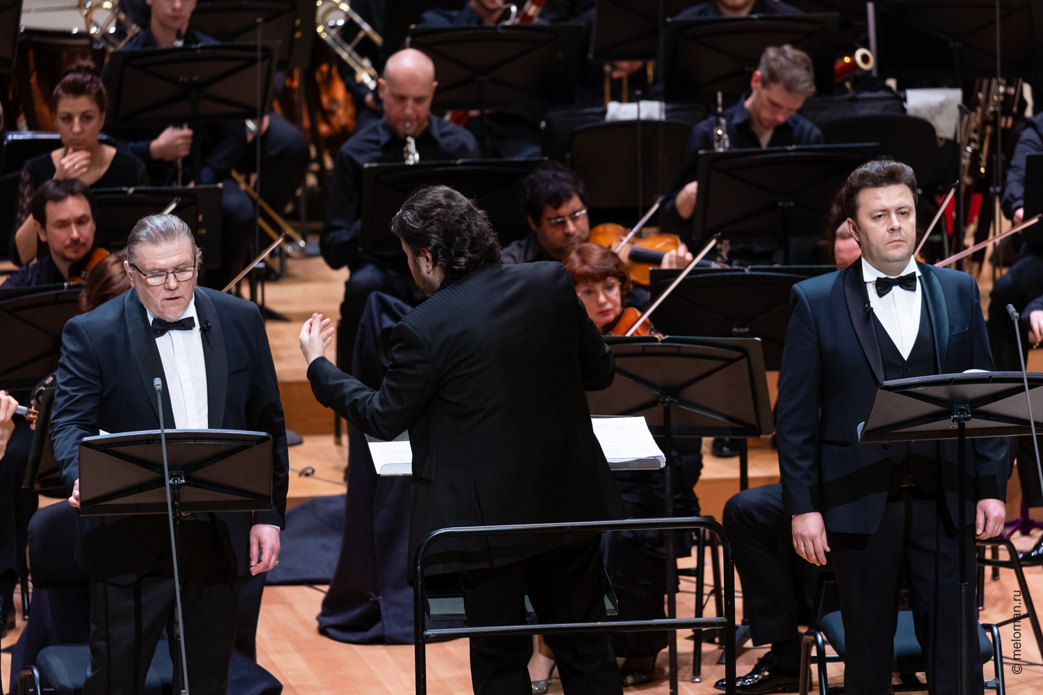 Цемлинский это требование выполнил в полной мере, создав на основе пьесы Андрэ Жида трагедию высшей пробы. Язык ее непрост: в многослойнейшей фактуре масса лейтмотивов, то так, то этак сопряженных между собой или не сопряженных вовсе, консонансы, балансирующие на грани с диссонансами, тональное, опасно приближающееся к атональному. При этом красок – вдосталь. Красоты, отрадной даже ярому стороннику классики, – немерено. Экспрессия – зашкаливает. По крайней мере у Юровского, порой доводящего ее до состояния труднопереносимых психических атак. Конечно, эту музыку можно сыграть и по-другому – что демонстрирует, к примеру, рафинированный Кент Нагано в сохранившейся записи с Зальцбургского фестиваля. Но вопрос интерпретации в ситуации премьерного исполнения не слишком важен. Довольно высокого уровня оркестрового мастерства и наличия подходящих вокалистов. Первое в московском концерте присутствовало: светлановский оркестр – из тех коллективов, что гарантируют качество при любых обстоятельствах. С вокалистами все было не так однозначно.